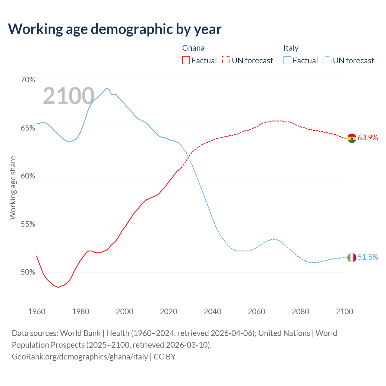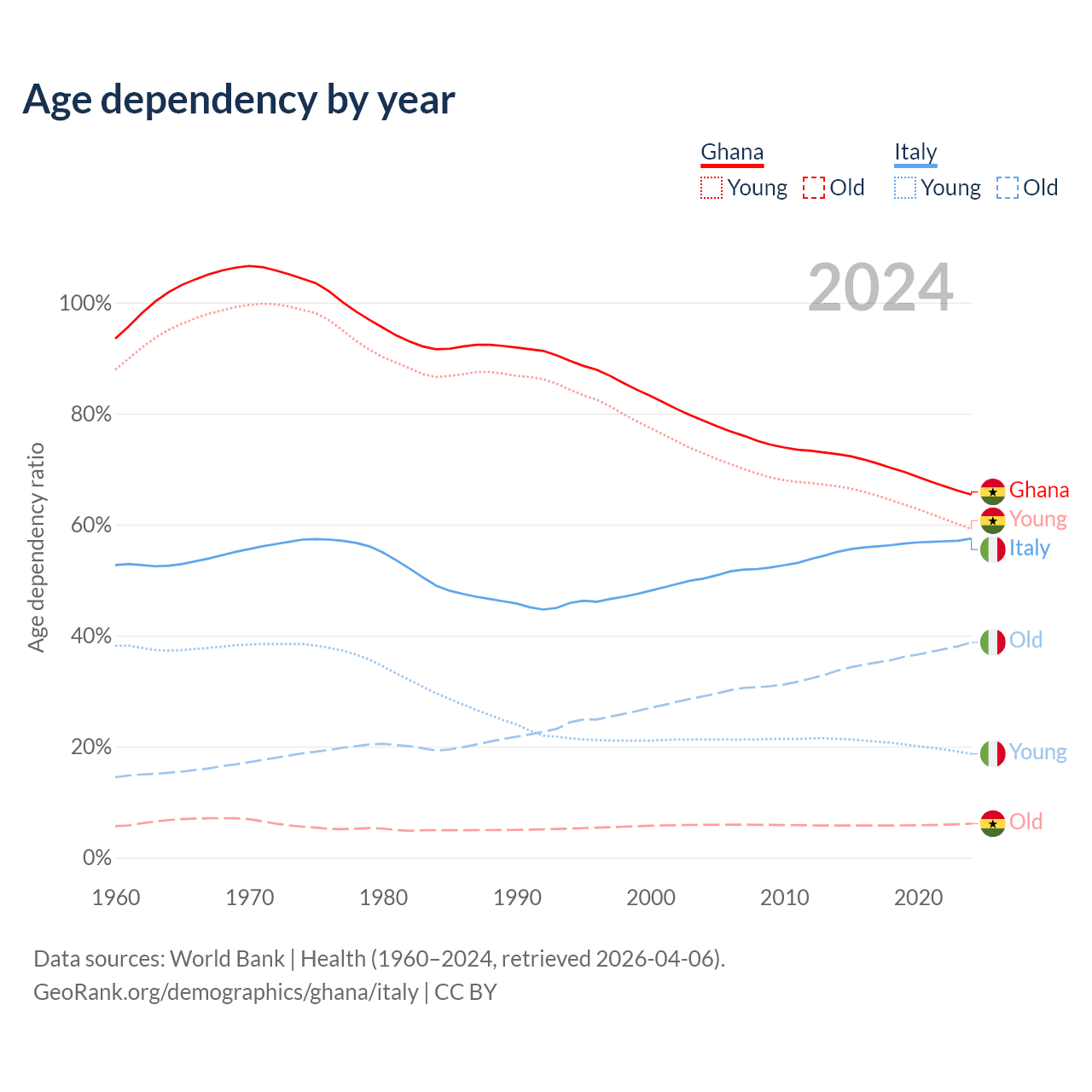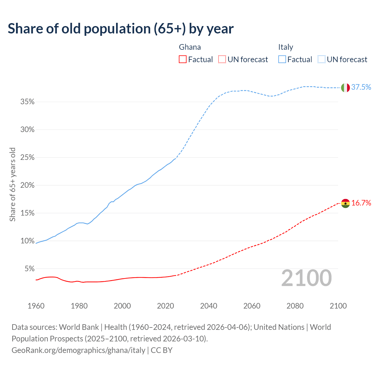 The share of older people aged 65 and over is 3.71% in Ghana and 24.6% in Italy. Life expectancy in Ghana compared to Italy .