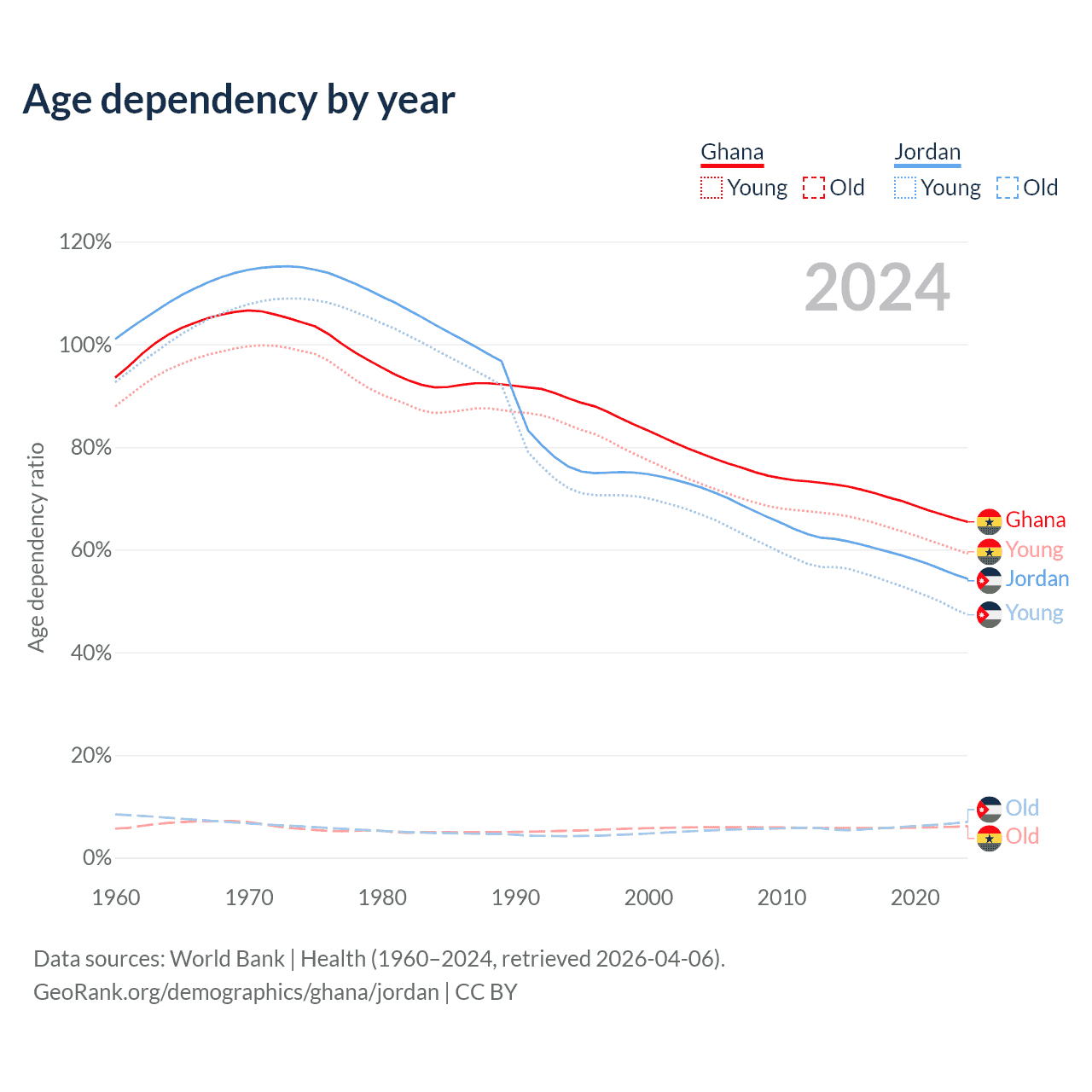 - Ghana is ranked 146/196 by median age (oldest to youngest) vs 131/196 for Jordan.