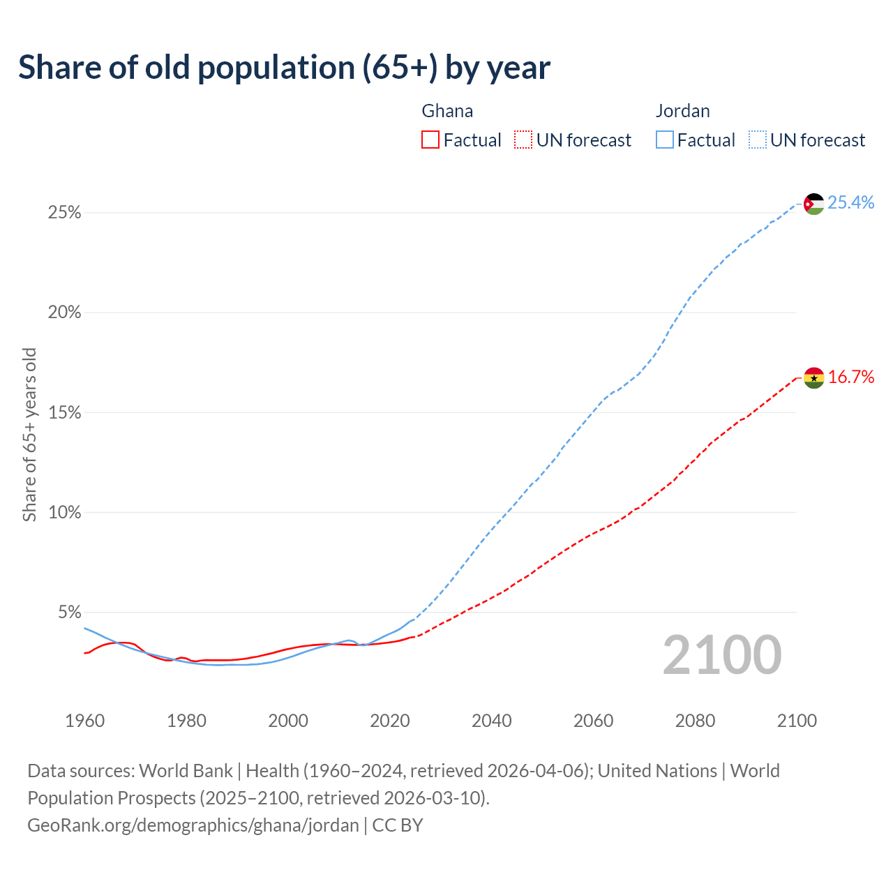 The share of older people aged 65 and over is 3.71% in Ghana and 4.52% in Jordan. Life expectancy in Ghana compared to Jordan .