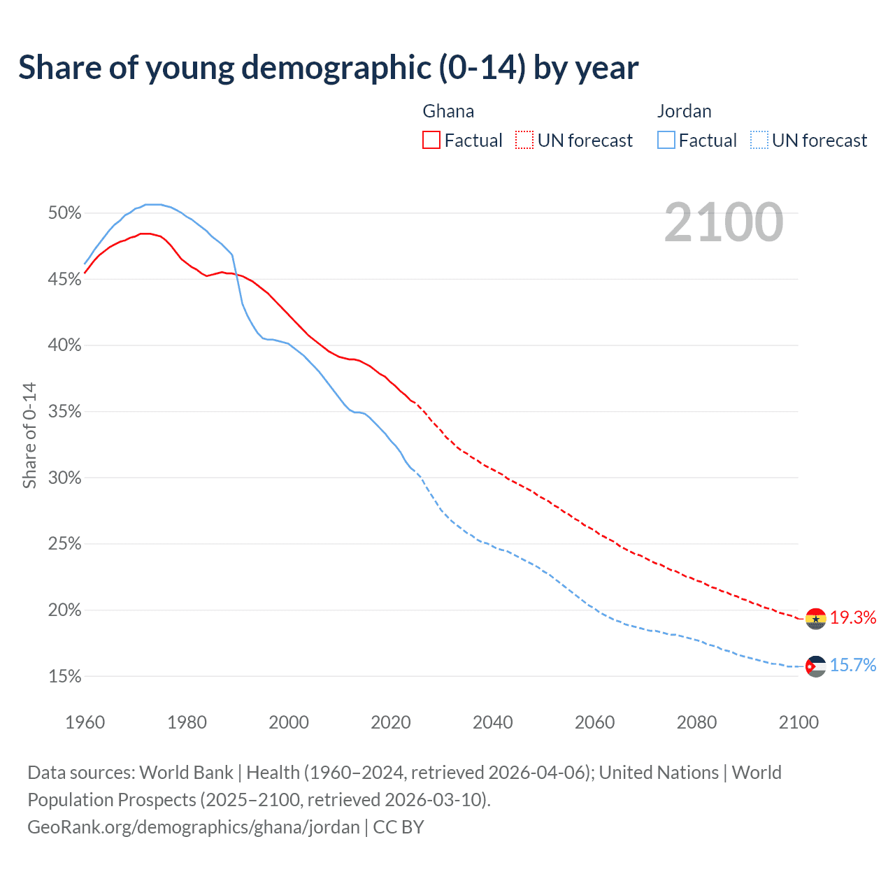 - The share of young demographic (0-15 years old) in Ghana is 35.8% vs 30.7% in Jordan.
