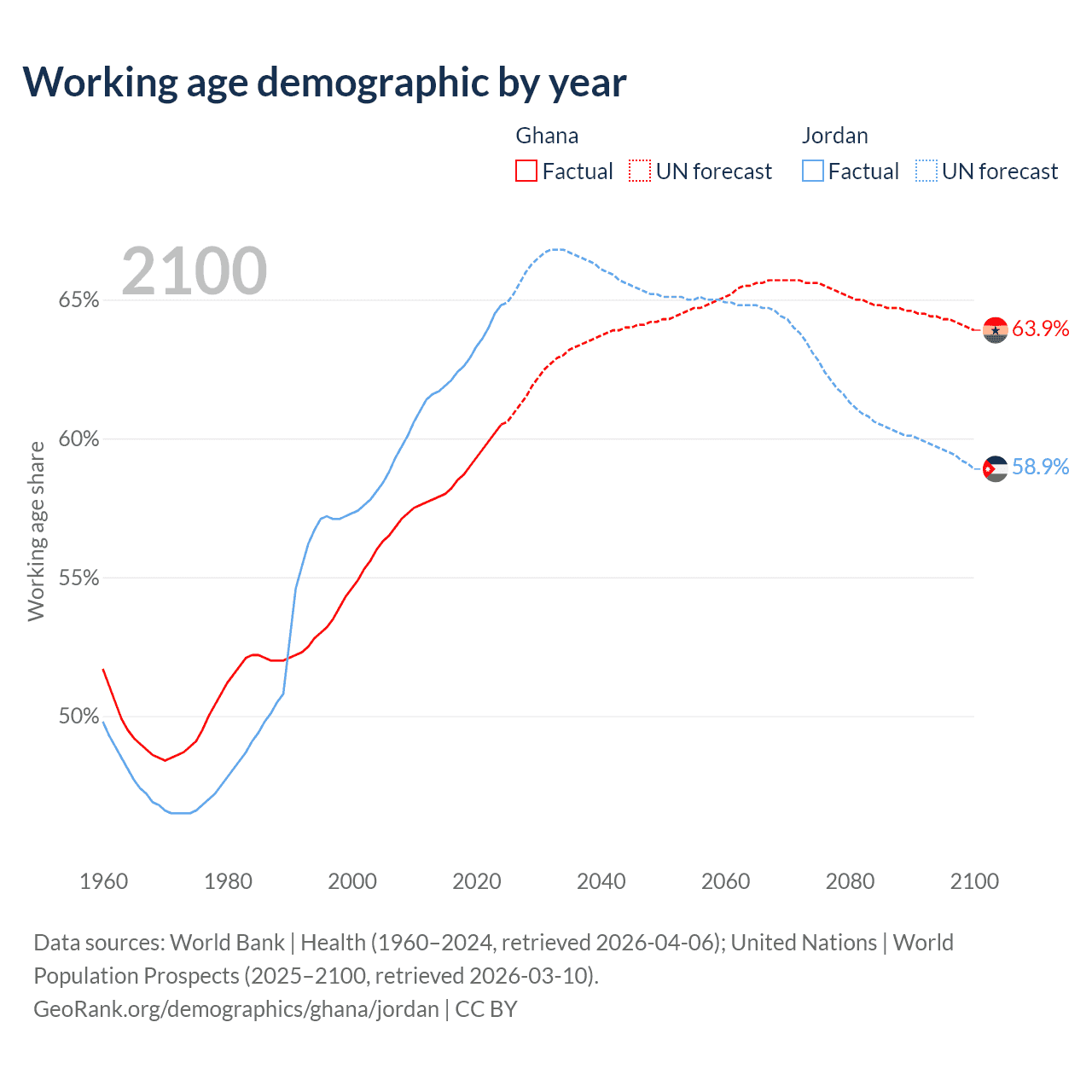 - Ghana has 21.7M working age adults (aged 15-64) vs 7.49M in Jordan.