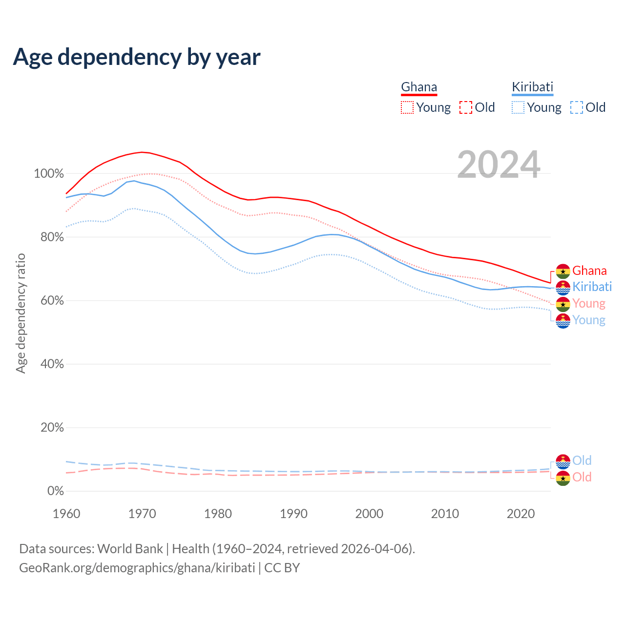 - Ghana is ranked 146/196 by median age (oldest to youngest) vs 139/196 for Kiribati.
