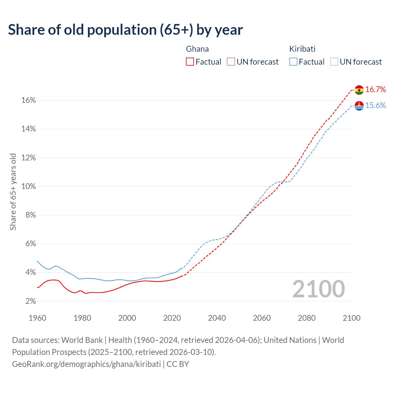 - The share of old-age demographic (65+) in Ghana is 3.71% vs 4.24% in Kiribati.