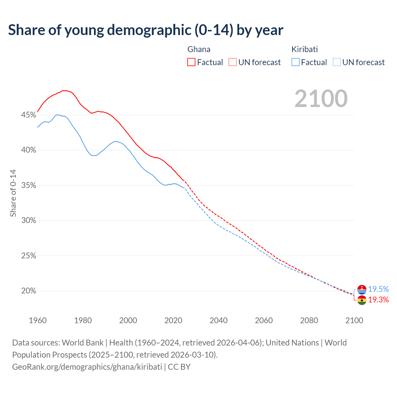 - The share of young demographic (0-15 years old) in Ghana is 35.8% vs 34.7% in Kiribati.