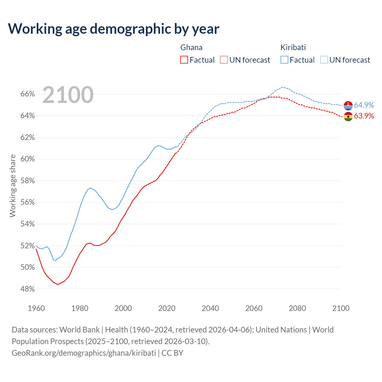 - Ghana has 21.7M working age adults (aged 15-64) vs 84.9K in Kiribati.
