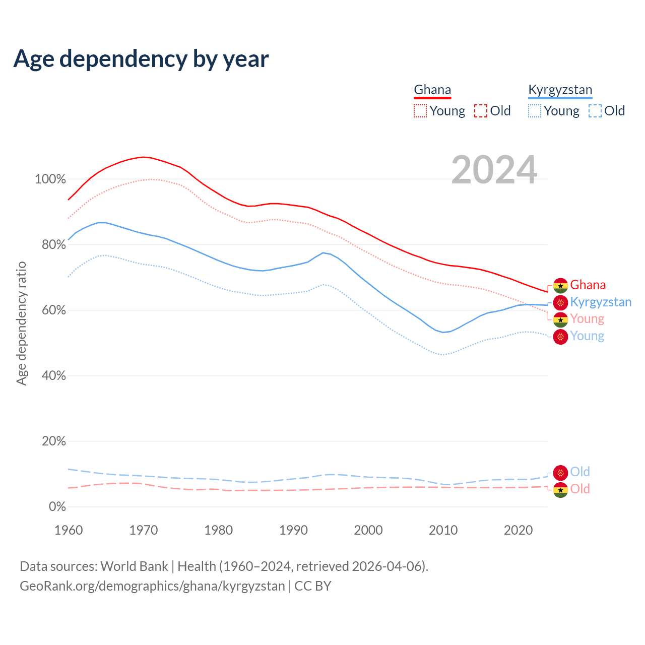 The share of older people aged 65 and over is 3.71% in Ghana and 5.68% in Kyrgyzstan. Life expectancy in Ghana compared to Kyrgyzstan .