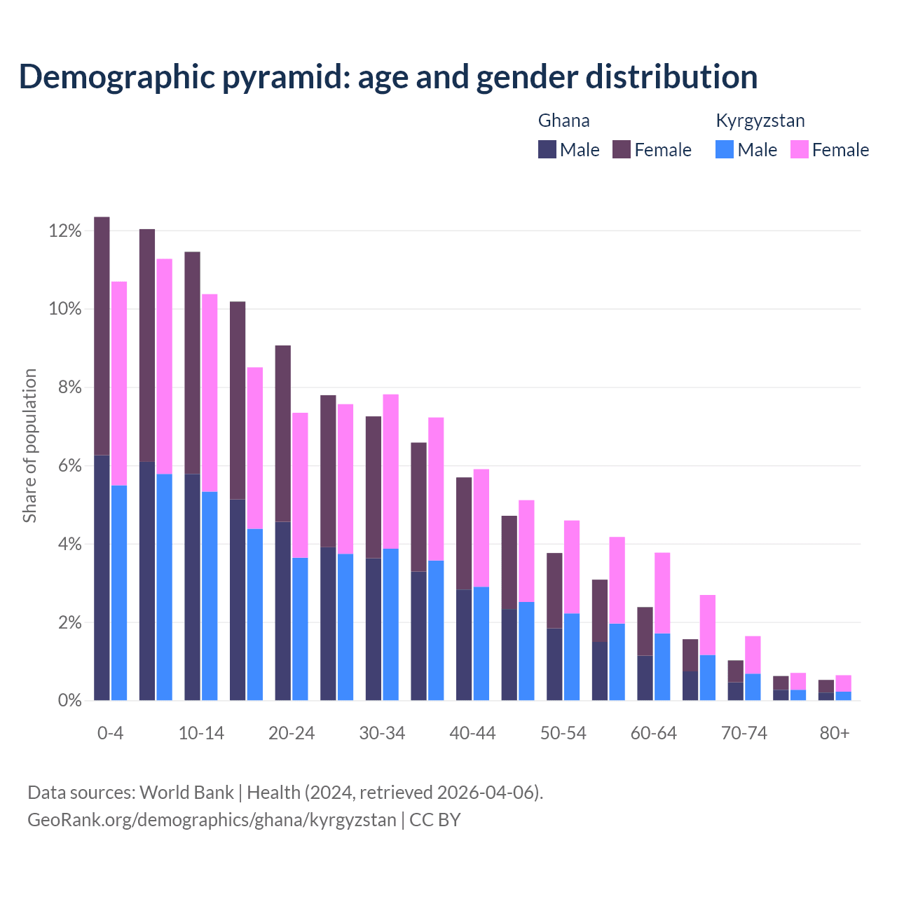 - As of 2026, the population of Ghana is 35.9M vs 7.47M in Kyrgyzstan - 4.8 times difference.