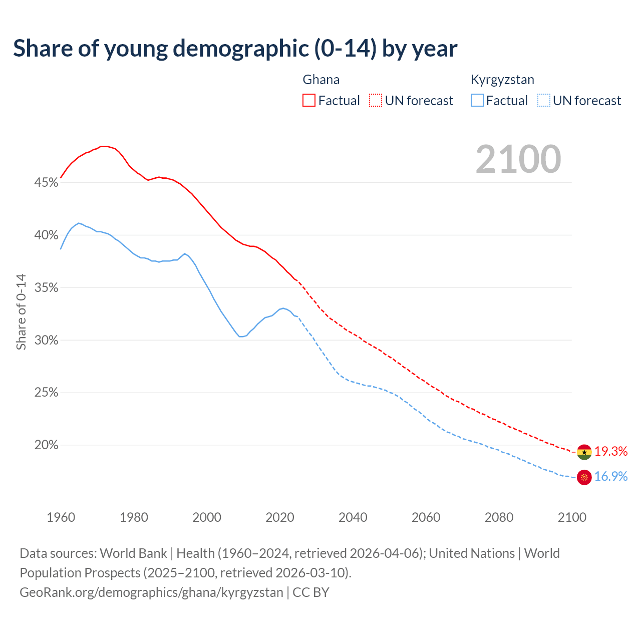 - The share of young demographic (0-15 years old) in Ghana is 35.8% vs 32.3% in Kyrgyzstan.