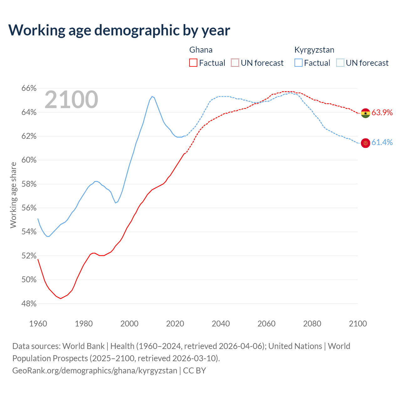 - Ghana has 21.7M working age adults (aged 15-64) vs 4.63M in Kyrgyzstan.