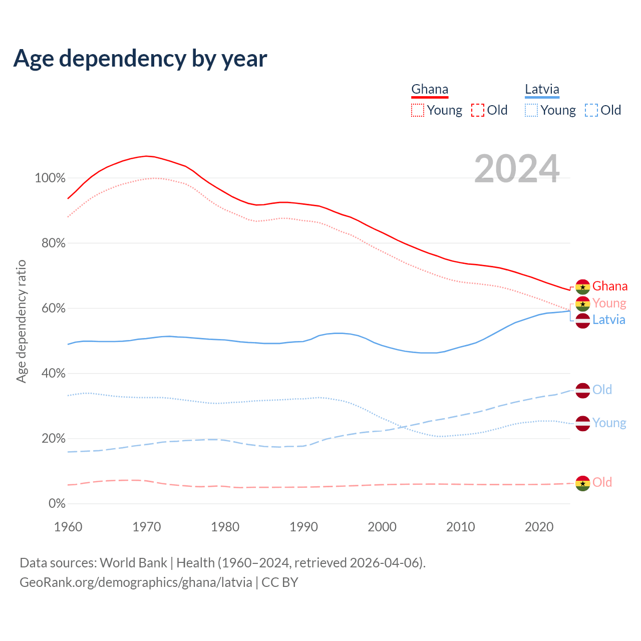 - Ghana is ranked 146/196 by median age (oldest to youngest) vs 20/196 for Latvia.