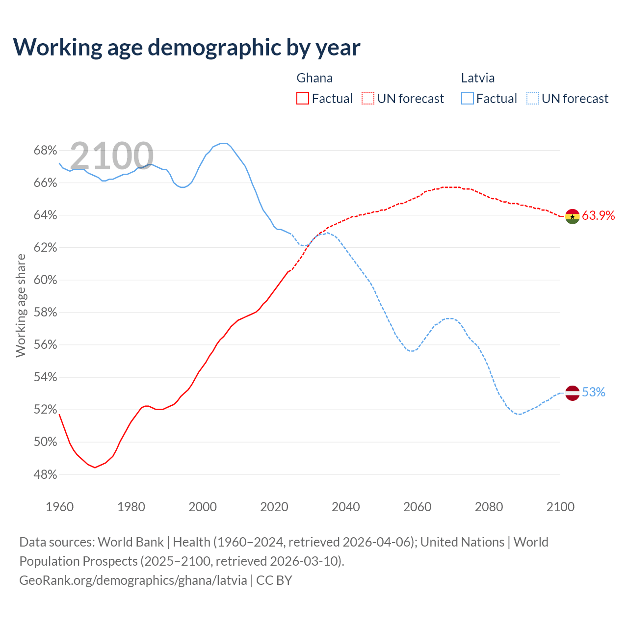 Median age Ghana vs Latvia, 1960-2100