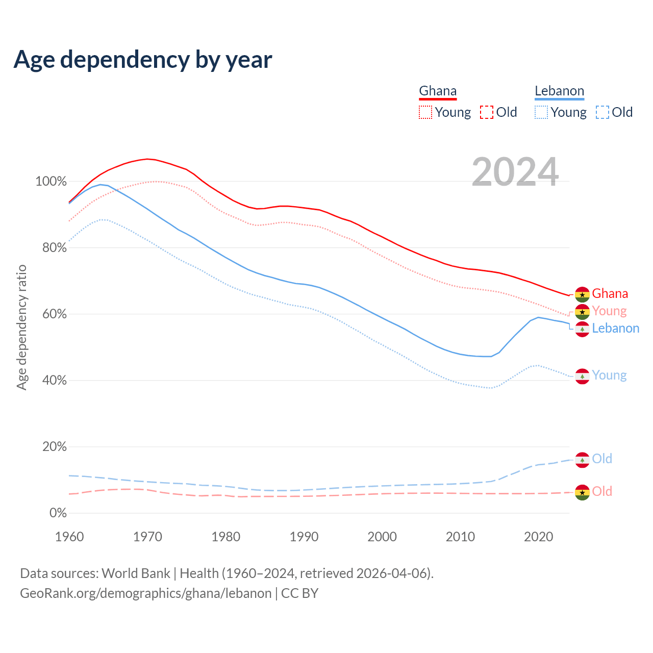 The share of older people aged 65 and over is 3.71% in Ghana and 10.1% in Lebanon. Life expectancy in Ghana compared to Lebanon .