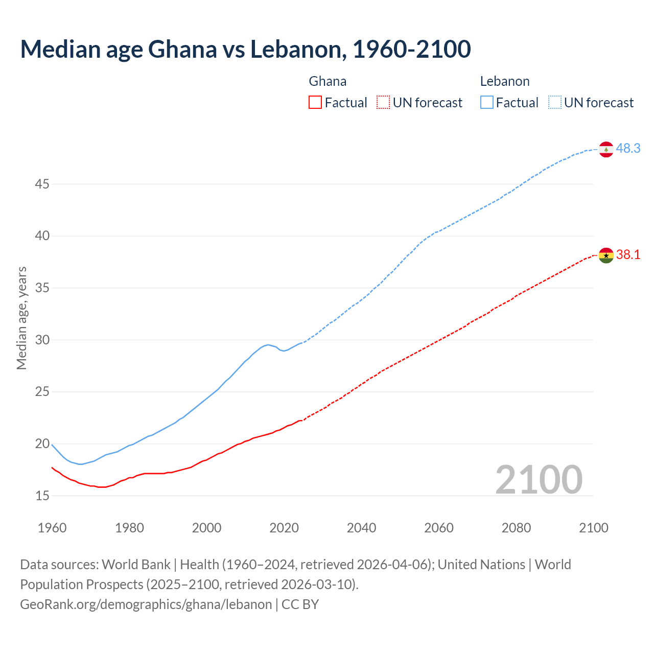 Median age Ghana vs Lebanon, 1960-2100