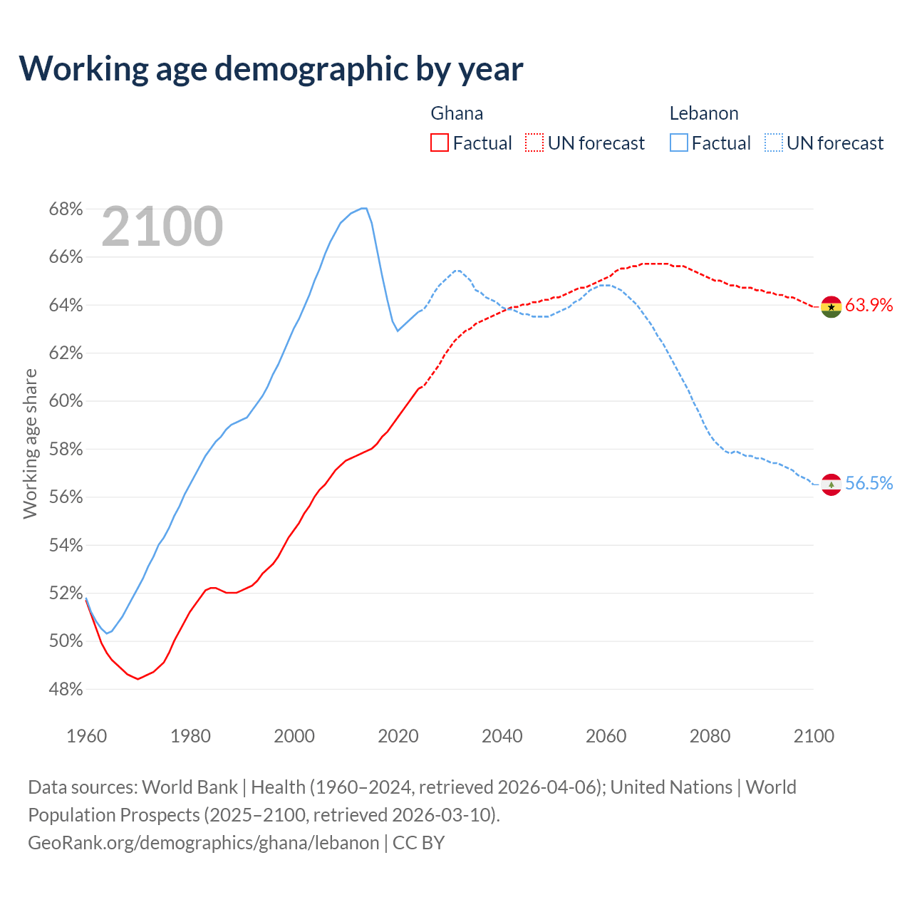 - Ghana has 21.7M working age adults (aged 15-64) vs 3.76M in Lebanon.