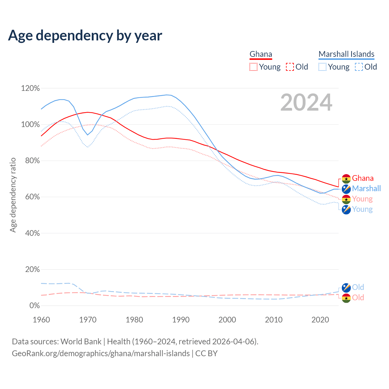 - The share of old-age demographic (65+) in Ghana is 3.71% vs 4.64% in the Marshall Islands.