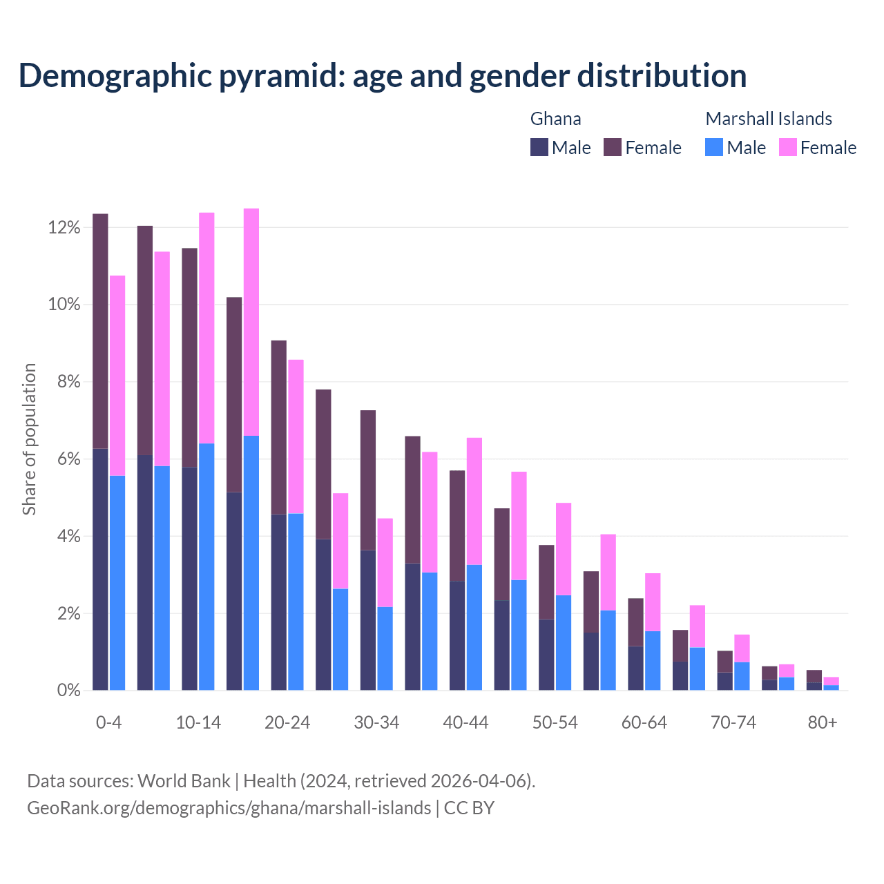 - The share of young demographic (0-15 years old) in Ghana is 35.8% vs 34.5% in the Marshall Islands.
