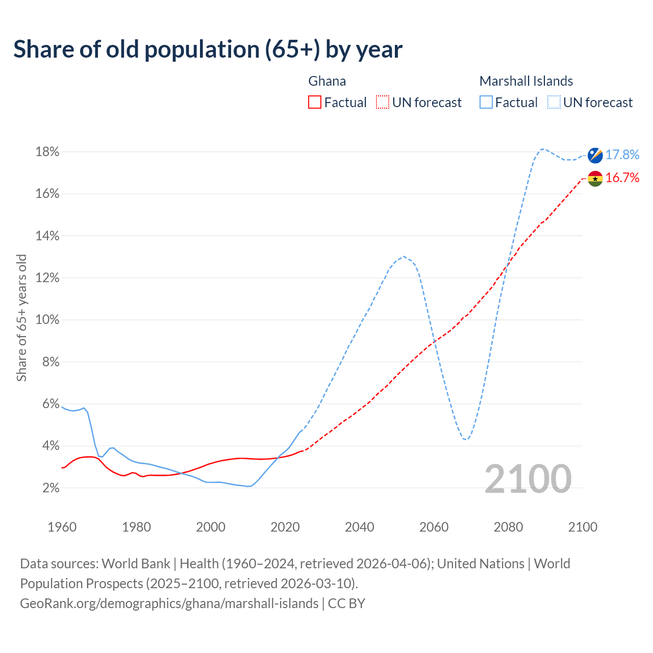 The share of older people aged 65 and over is 3.71% in Ghana and 4.64% in the Marshall Islands. Life expectancy in Ghana compared to the Marshall Islands .