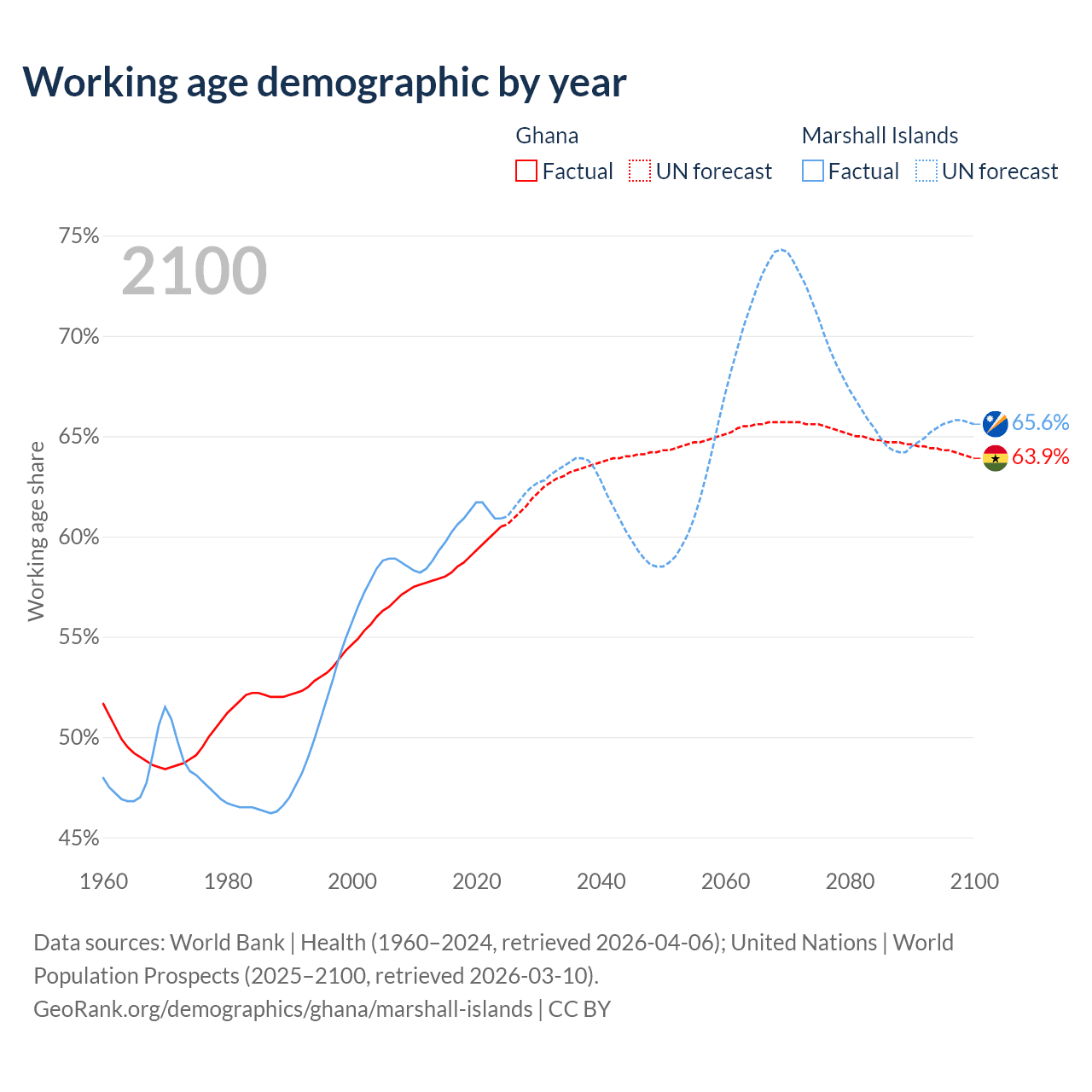 - Ghana has 21.7M working age adults (aged 15-64) vs 21.3K in the Marshall Islands.