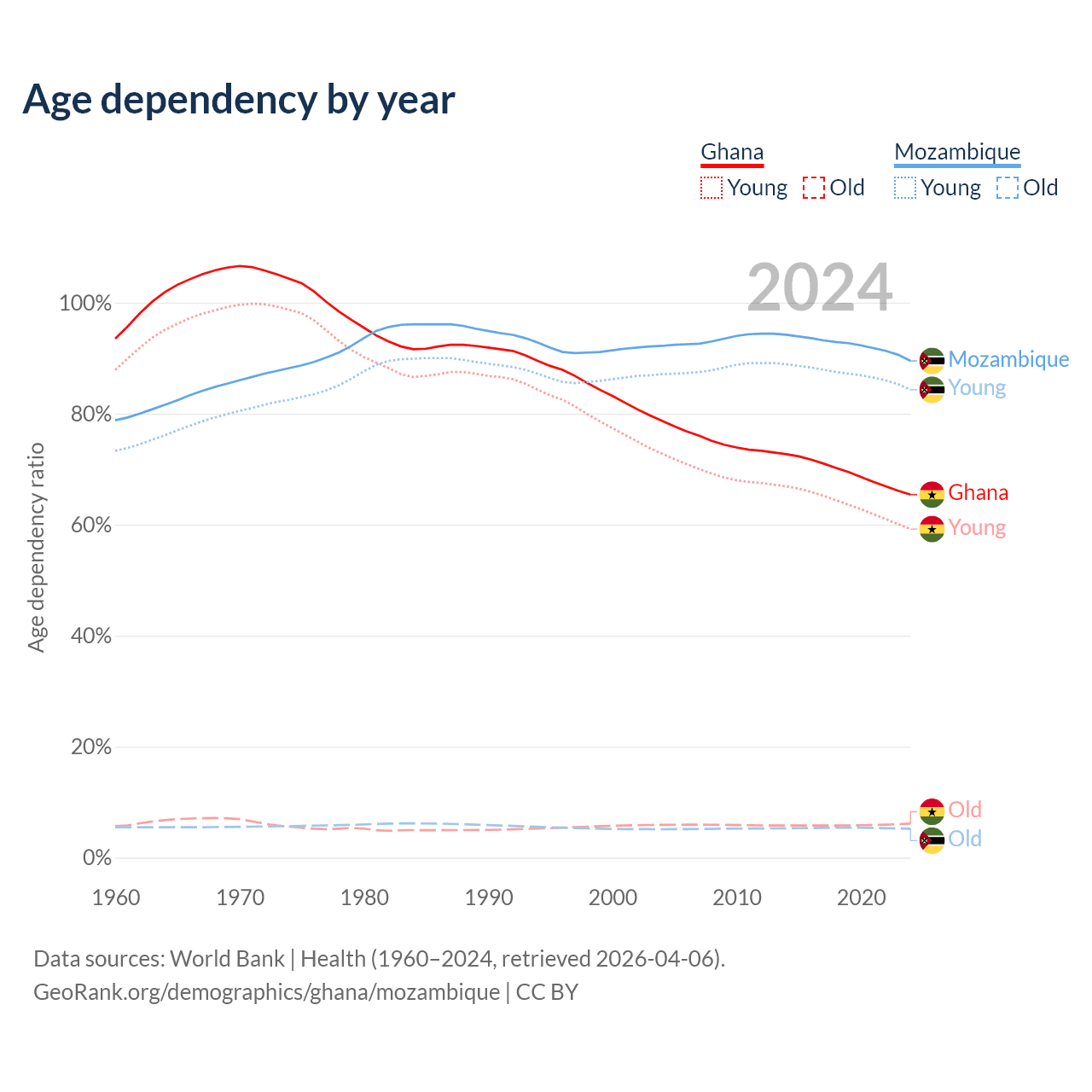 - Ghana is ranked 146/196 by median age (oldest to youngest) vs 189/196 for Mozambique.