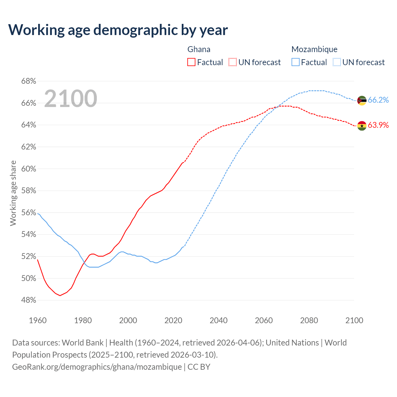 - Ghana has 21.7M working age adults (aged 15-64) vs 19.5M in Mozambique.