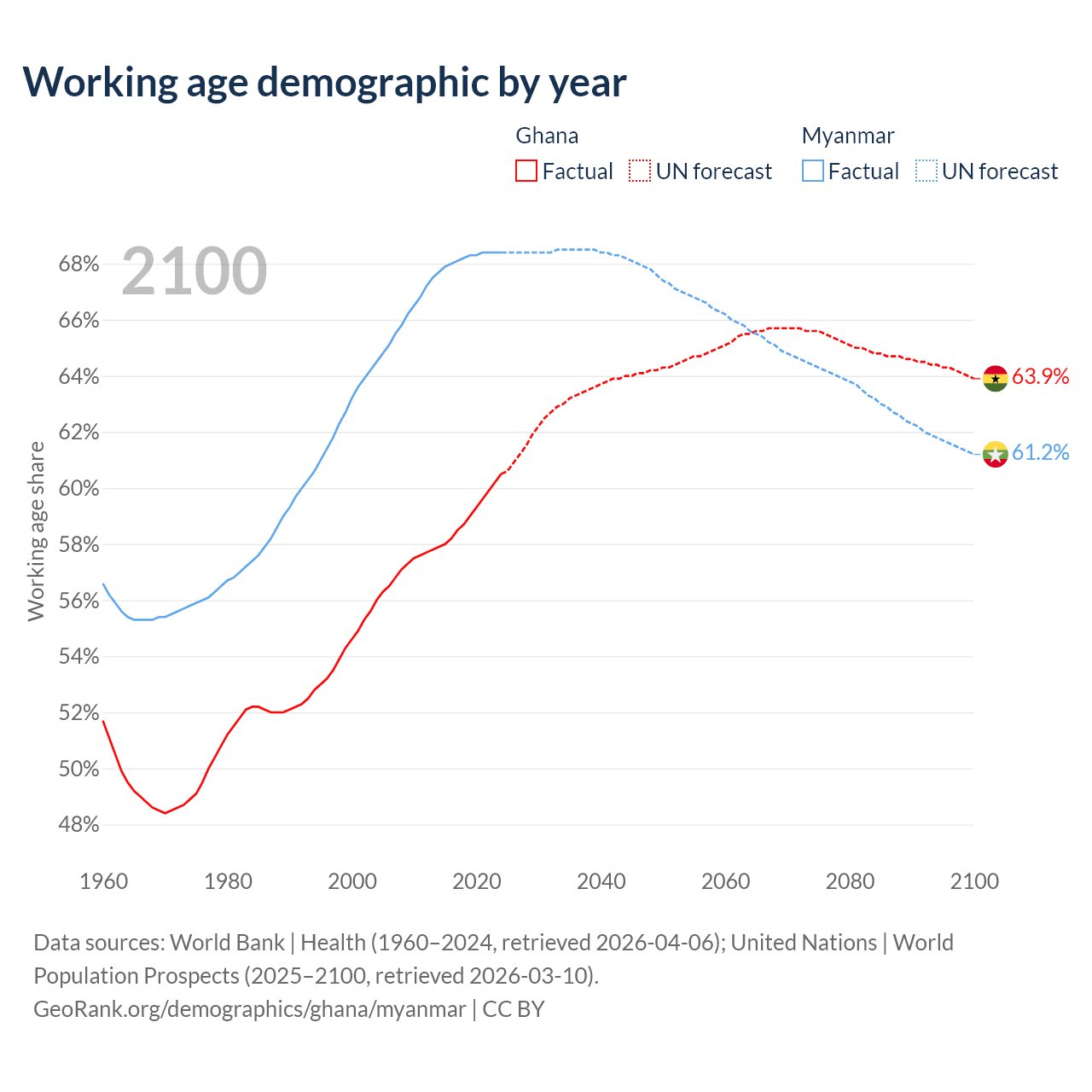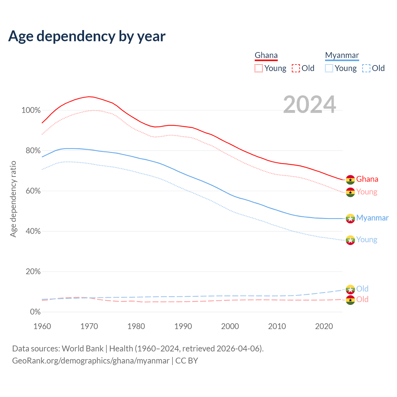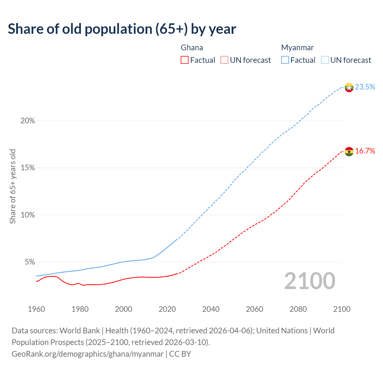 The share of older people aged 65 and over is 3.71% in Ghana and 7.3% in Myanmar. Life expectancy in Ghana compared to Myanmar .