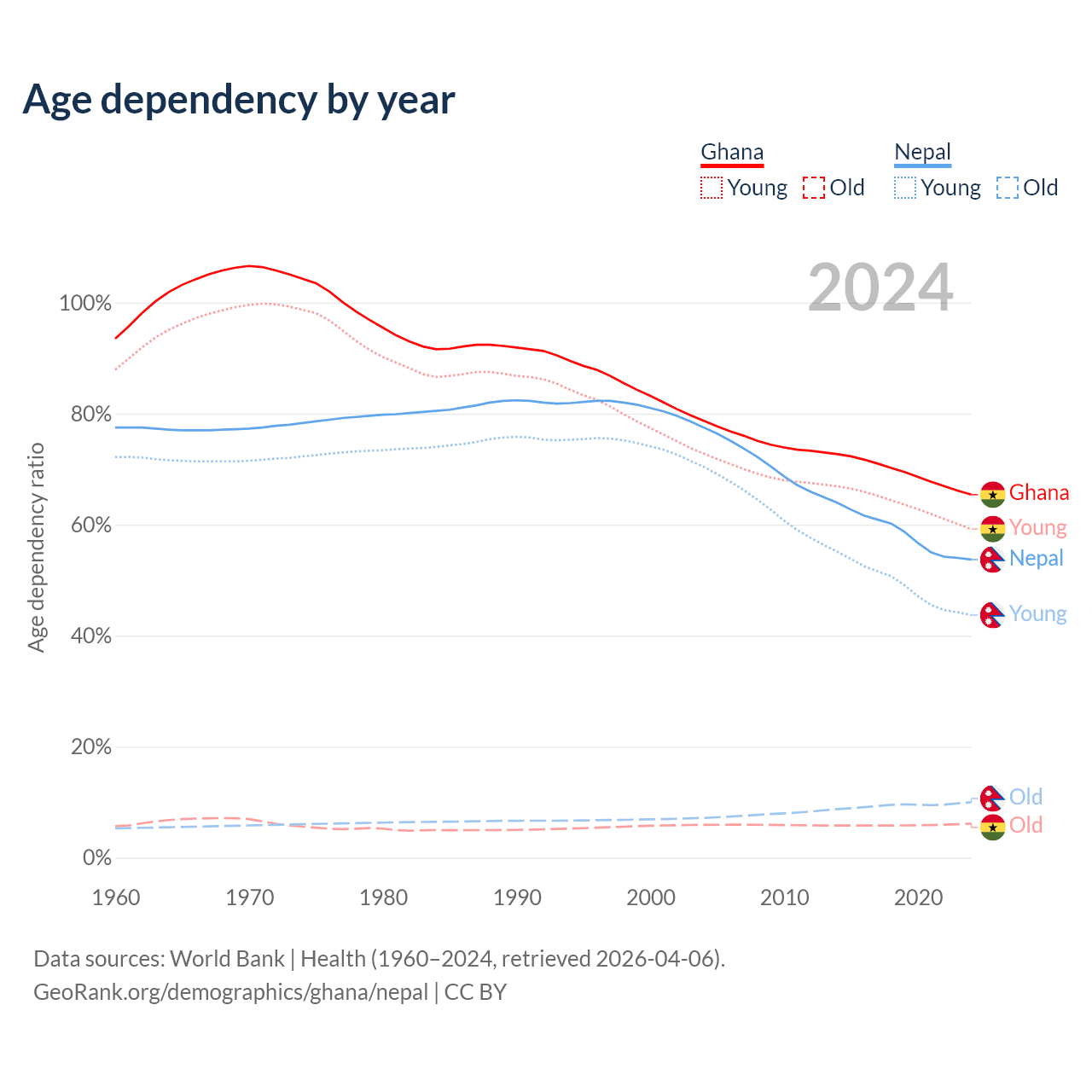 The share of older people aged 65 and over is 3.71% in Ghana and 6.5% in Nepal. Life expectancy in Ghana compared to Nepal .
