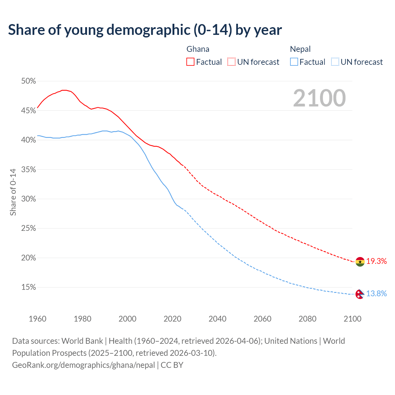 - The share of young demographic (0-15 years old) in Ghana is 35.8% vs 28.4% in Nepal.