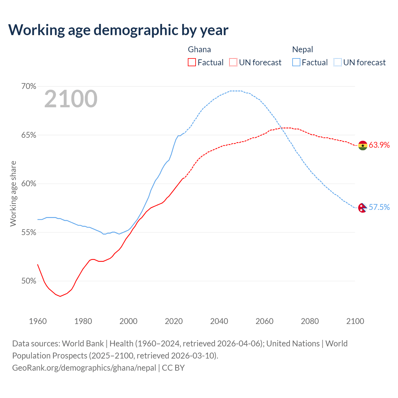 - Ghana has 21.7M working age adults (aged 15-64) vs 19.3M in Nepal.