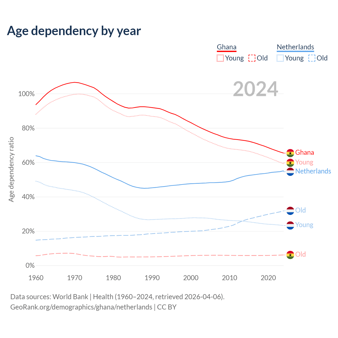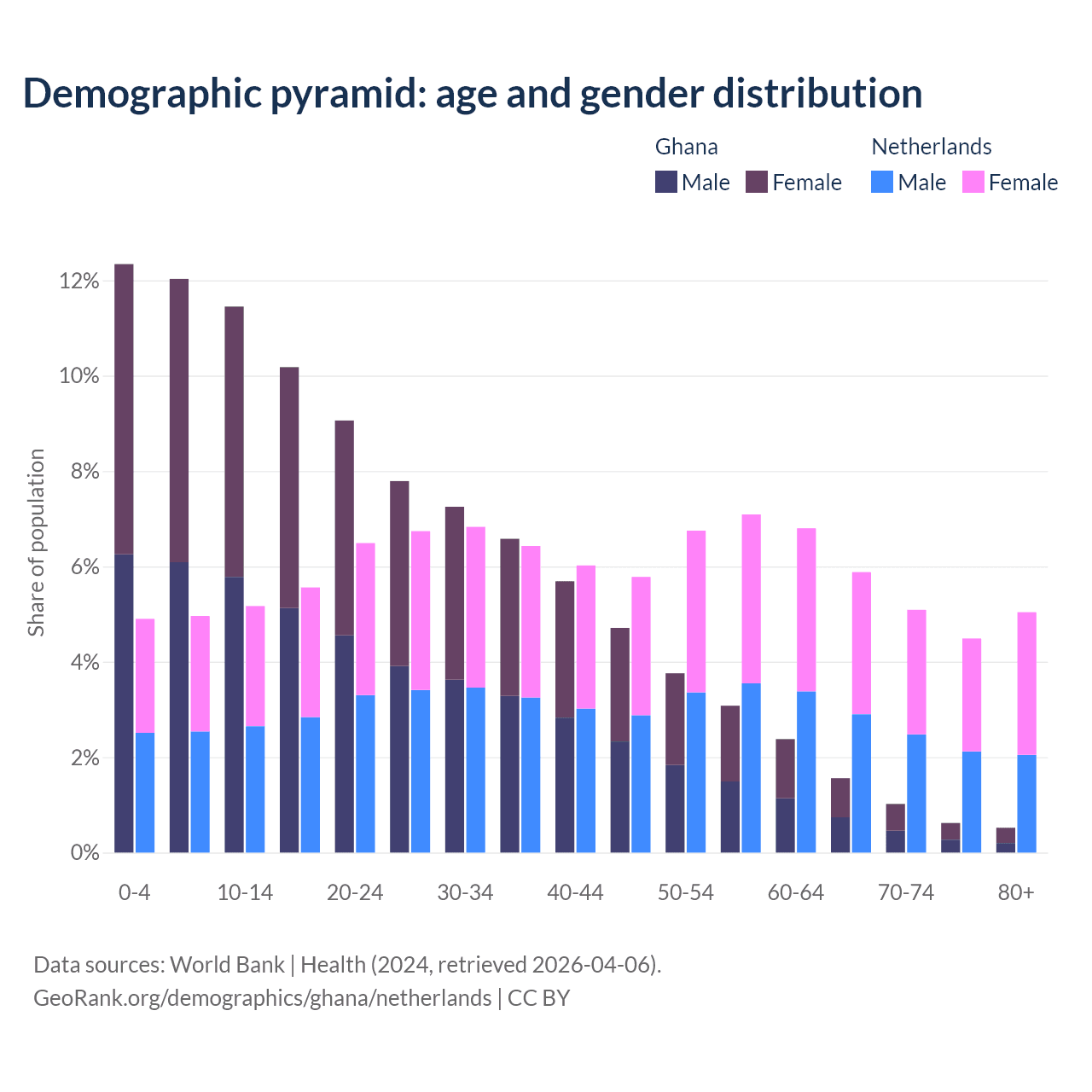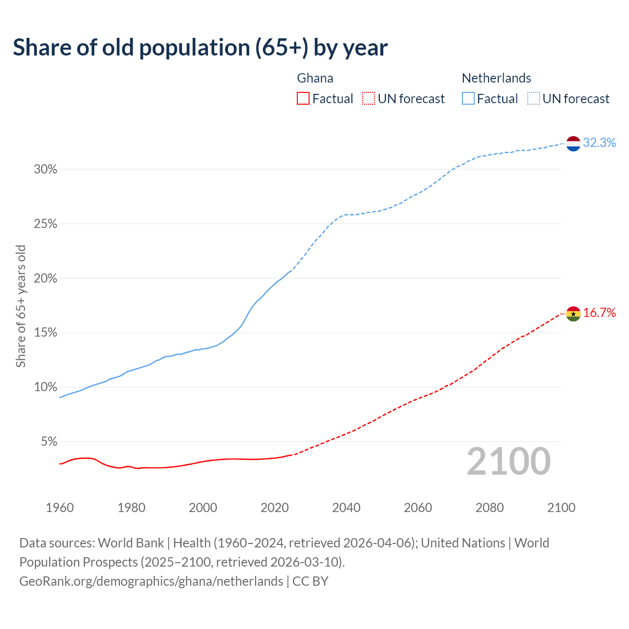The share of older people aged 65 and over is 3.71% in Ghana and 20.5% in the Netherlands. Life expectancy in Ghana compared to the Netherlands .