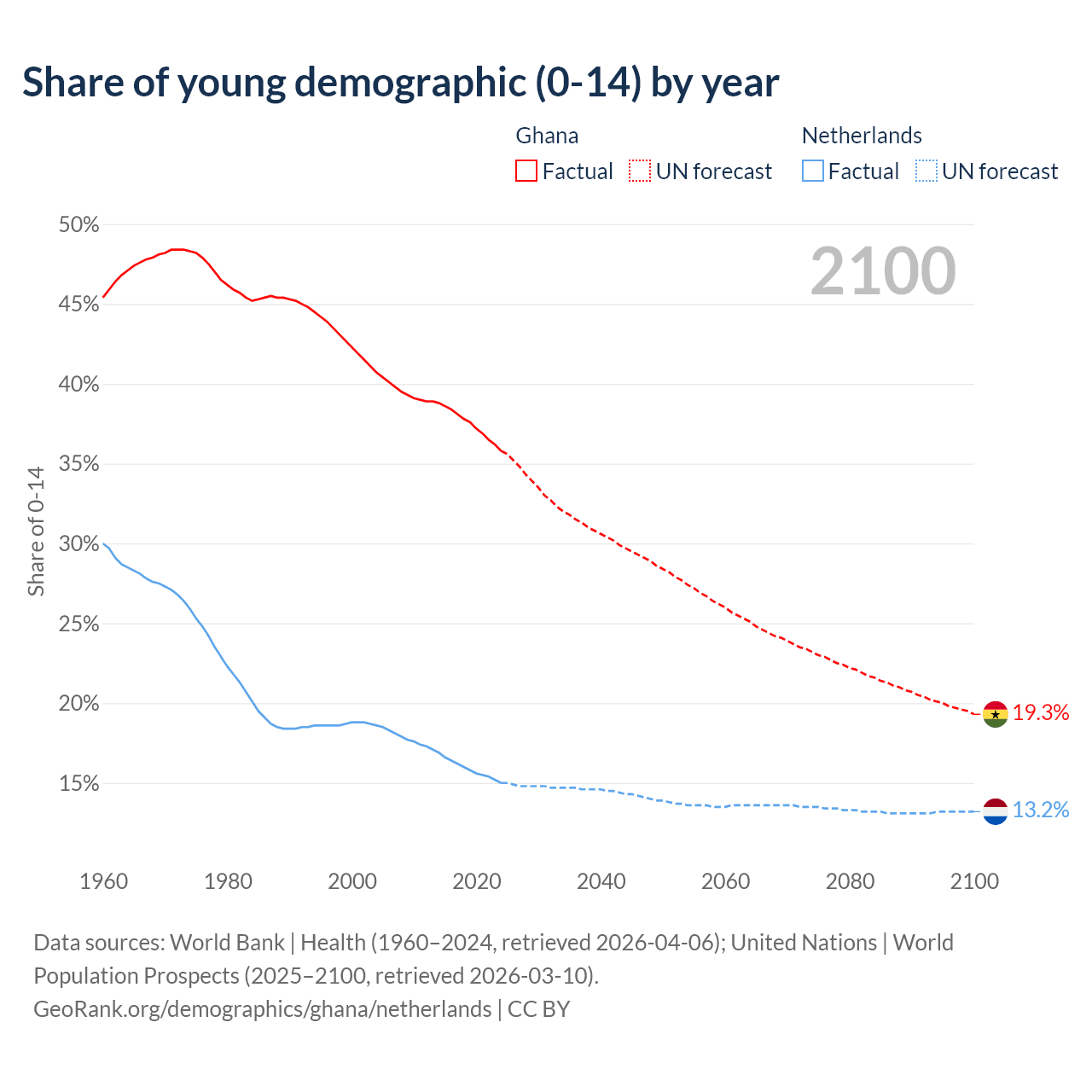 - The share of young demographic (0-15 years old) in Ghana is 35.8% vs 15% in the Netherlands.
