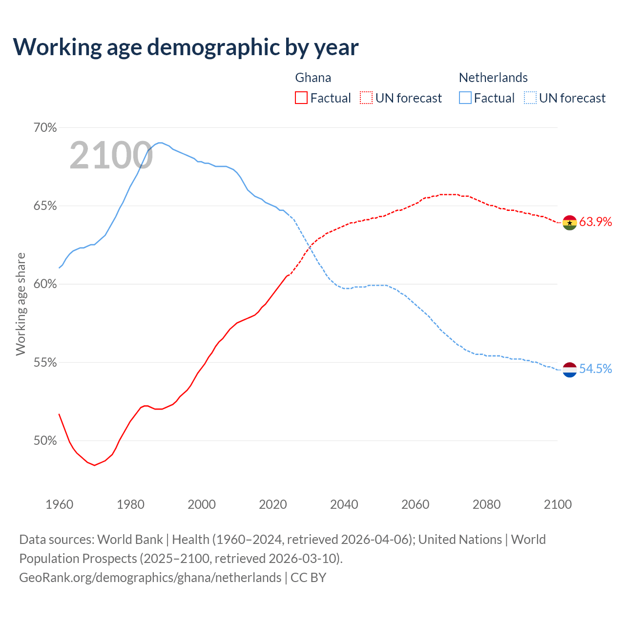 - Ghana has 21.7M working age adults (aged 15-64) vs 11.8M in the Netherlands.