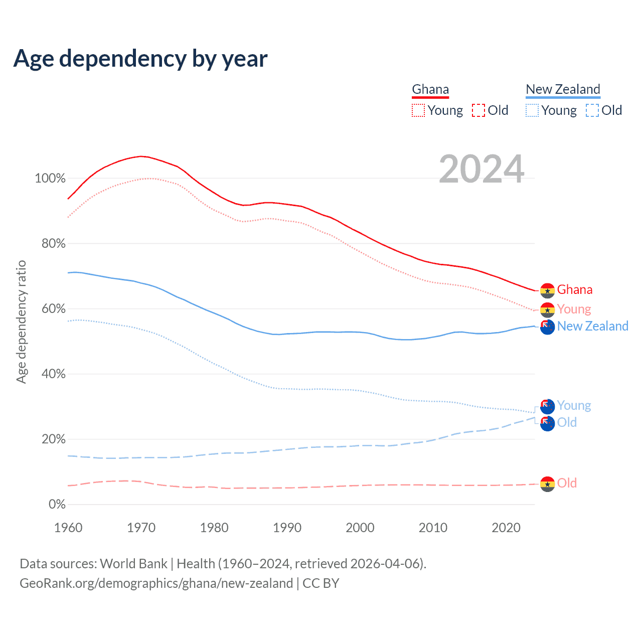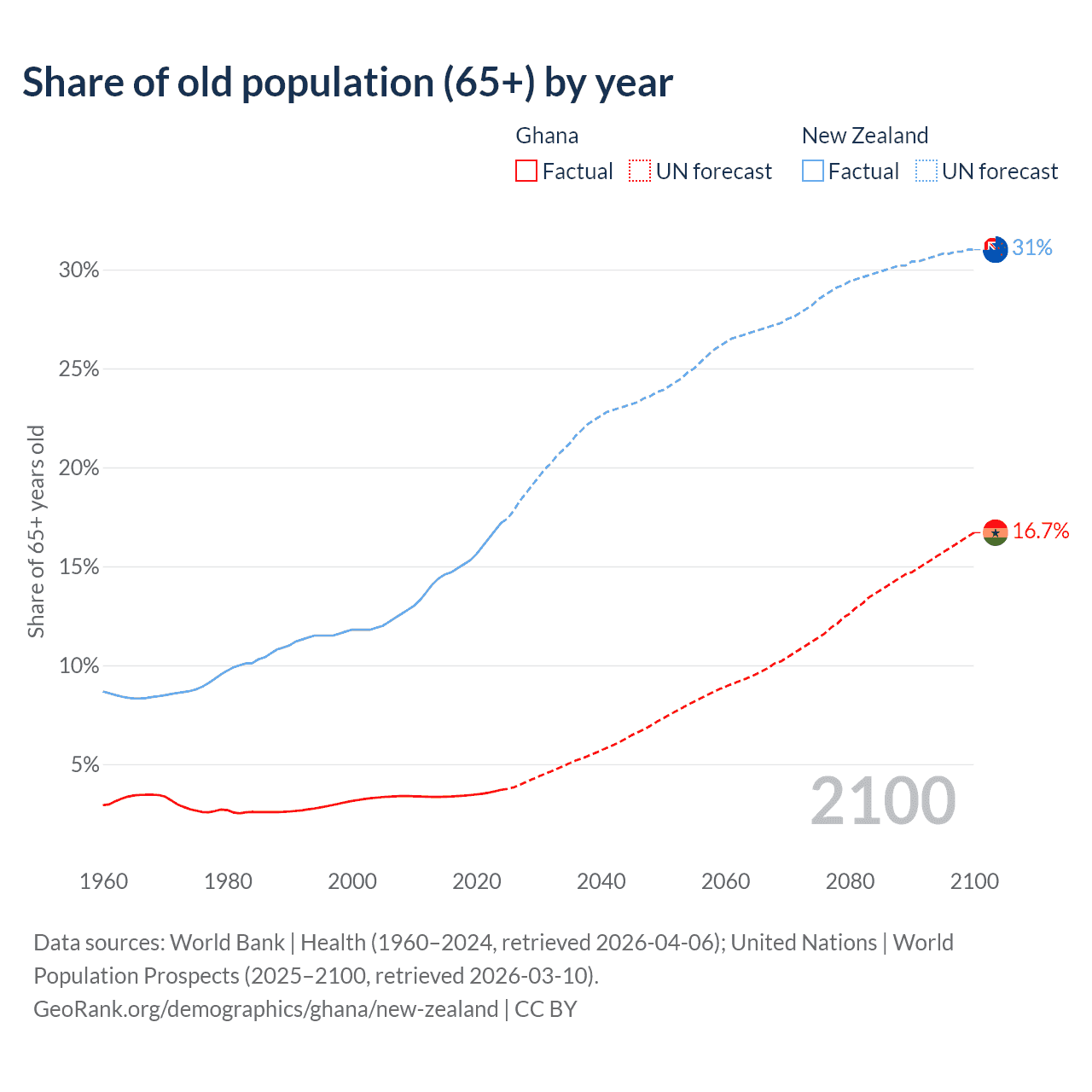 The share of older people aged 65 and over is 3.71% in Ghana and 17.2% in New Zealand. Life expectancy in Ghana compared to New Zealand .