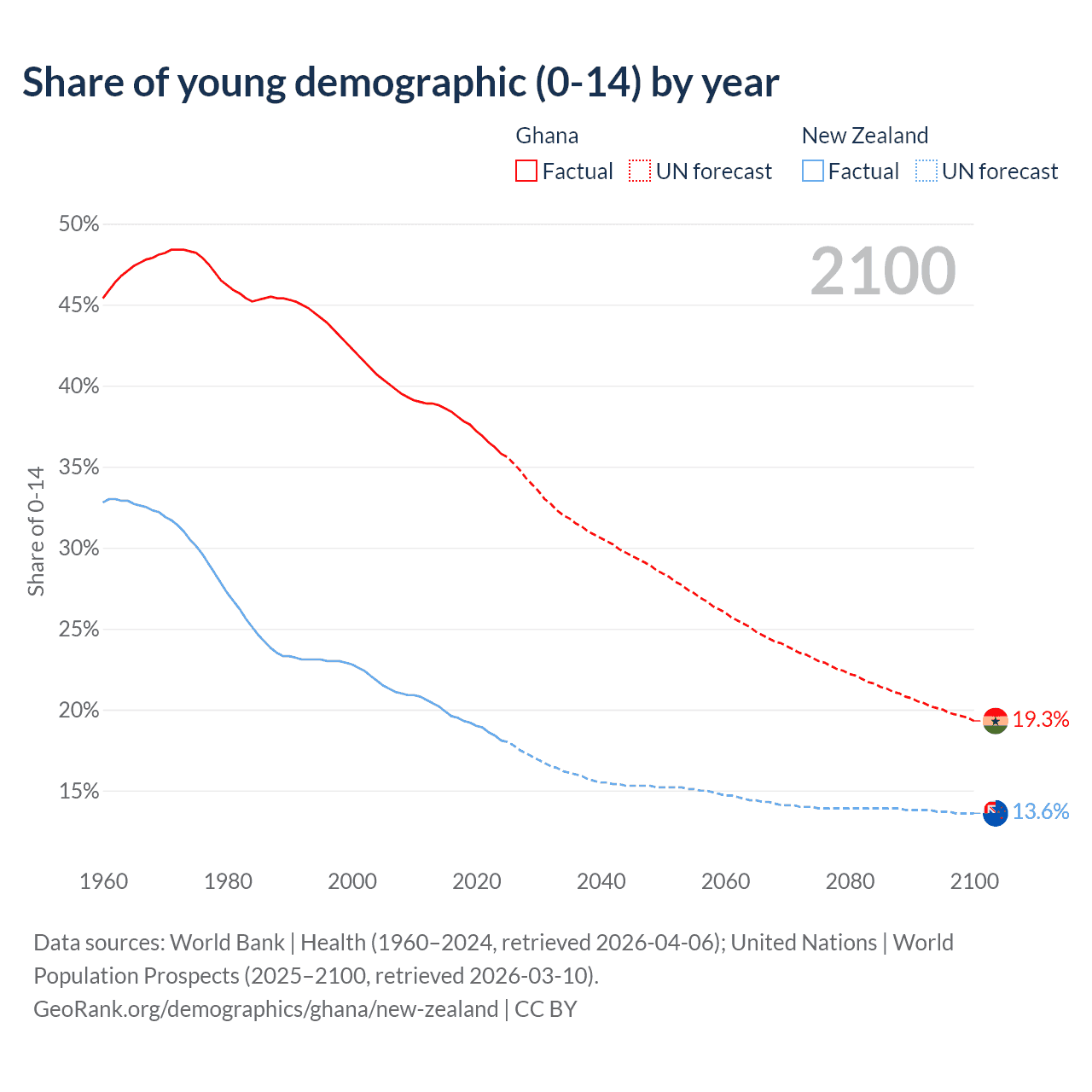 - The share of young demographic (0-15 years old) in Ghana is 35.8% vs 18.1% in New Zealand.