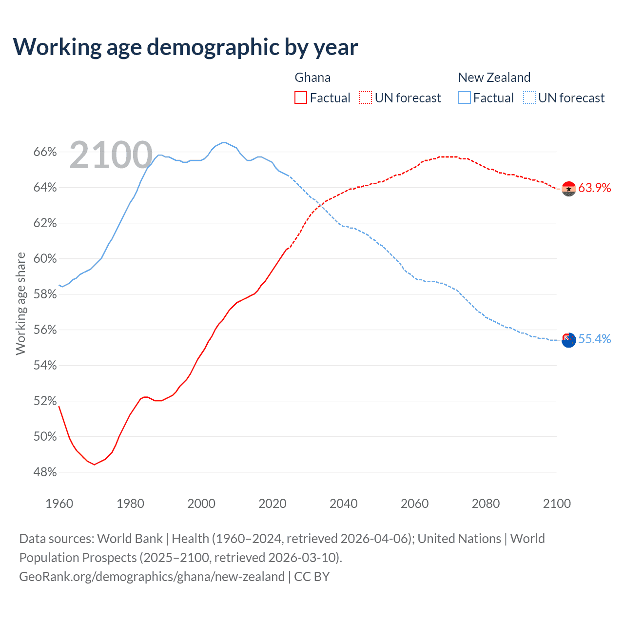 Median age Ghana vs New Zealand, 1960-2100
