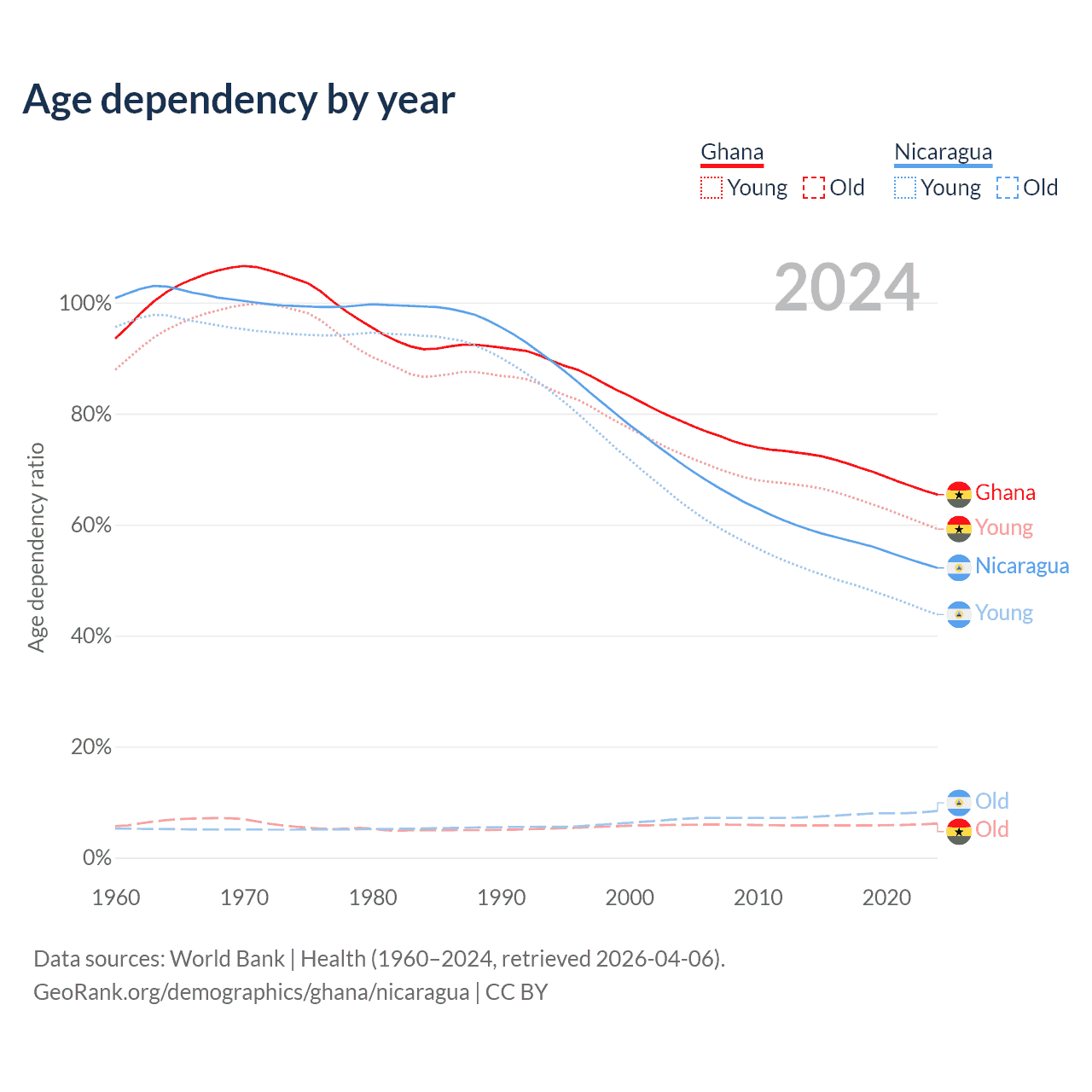 - The share of old-age demographic (65+) in Ghana is 3.71% vs 5.53% in Nicaragua.