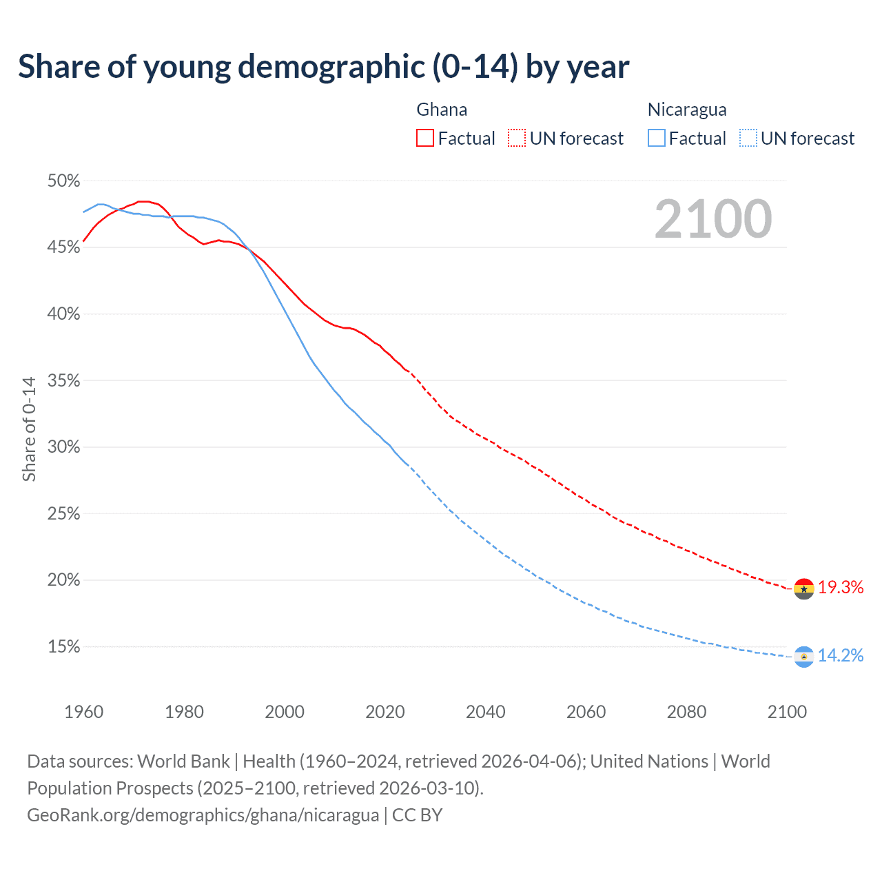 - The share of young demographic (0-15 years old) in Ghana is 35.8% vs 28.8% in Nicaragua.