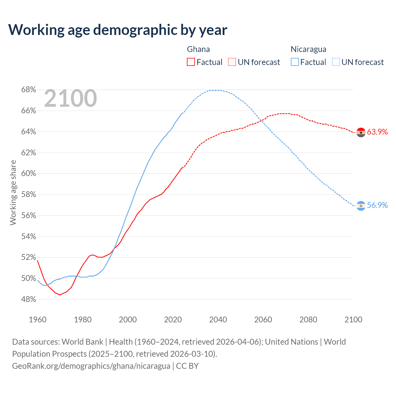 - Ghana has 21.7M working age adults (aged 15-64) vs 4.68M in Nicaragua.