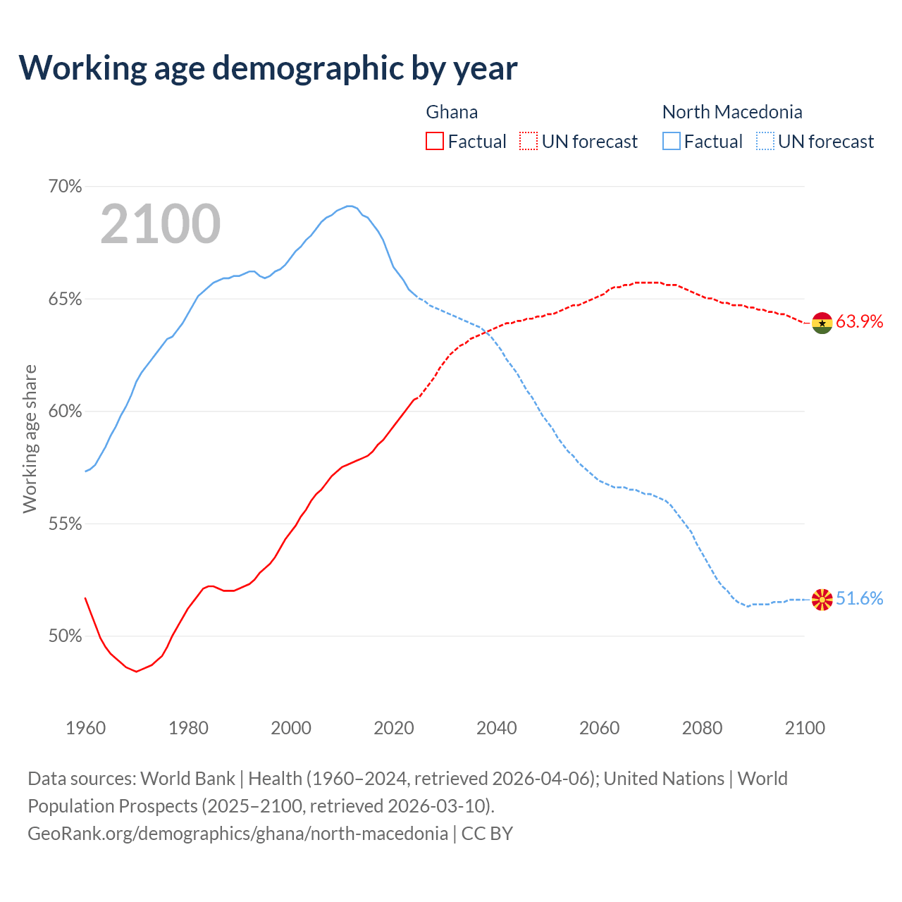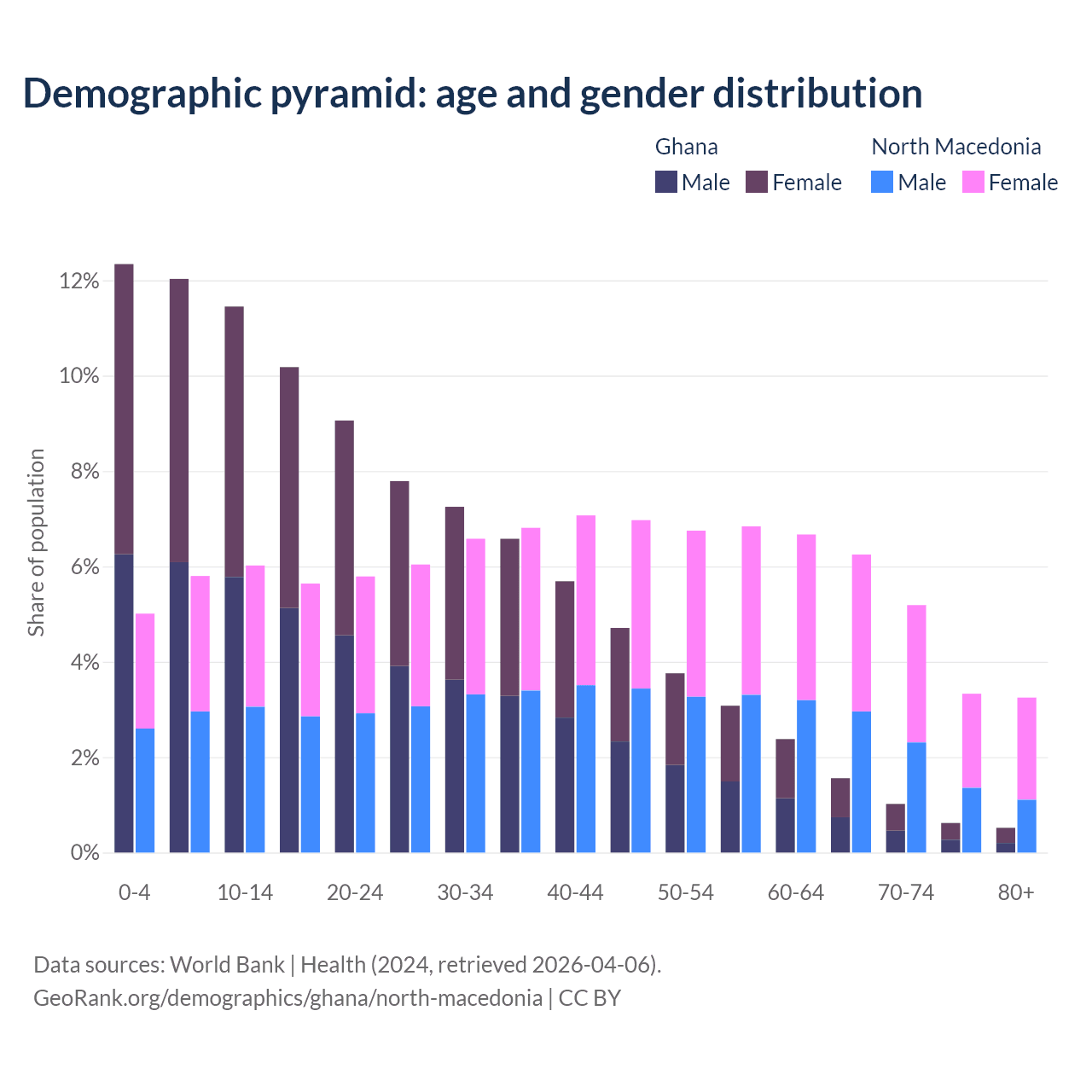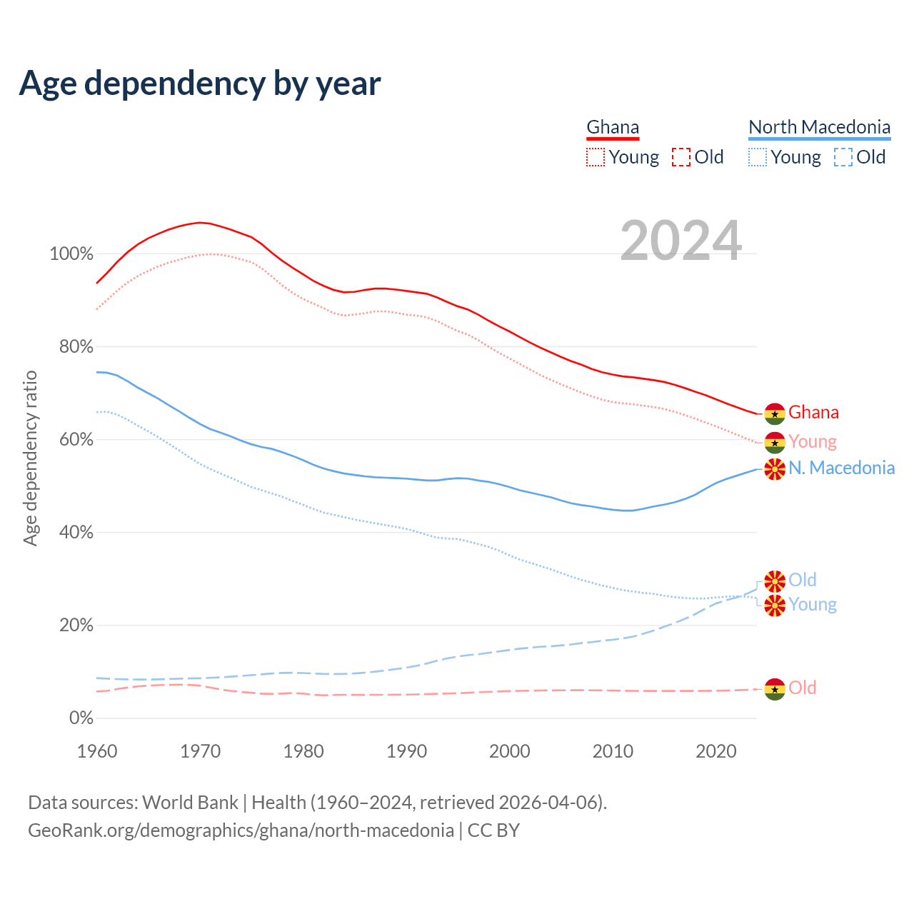The share of older people aged 65 and over is 3.71% in Ghana and 18% in North Macedonia. Life expectancy in Ghana compared to North Macedonia .
