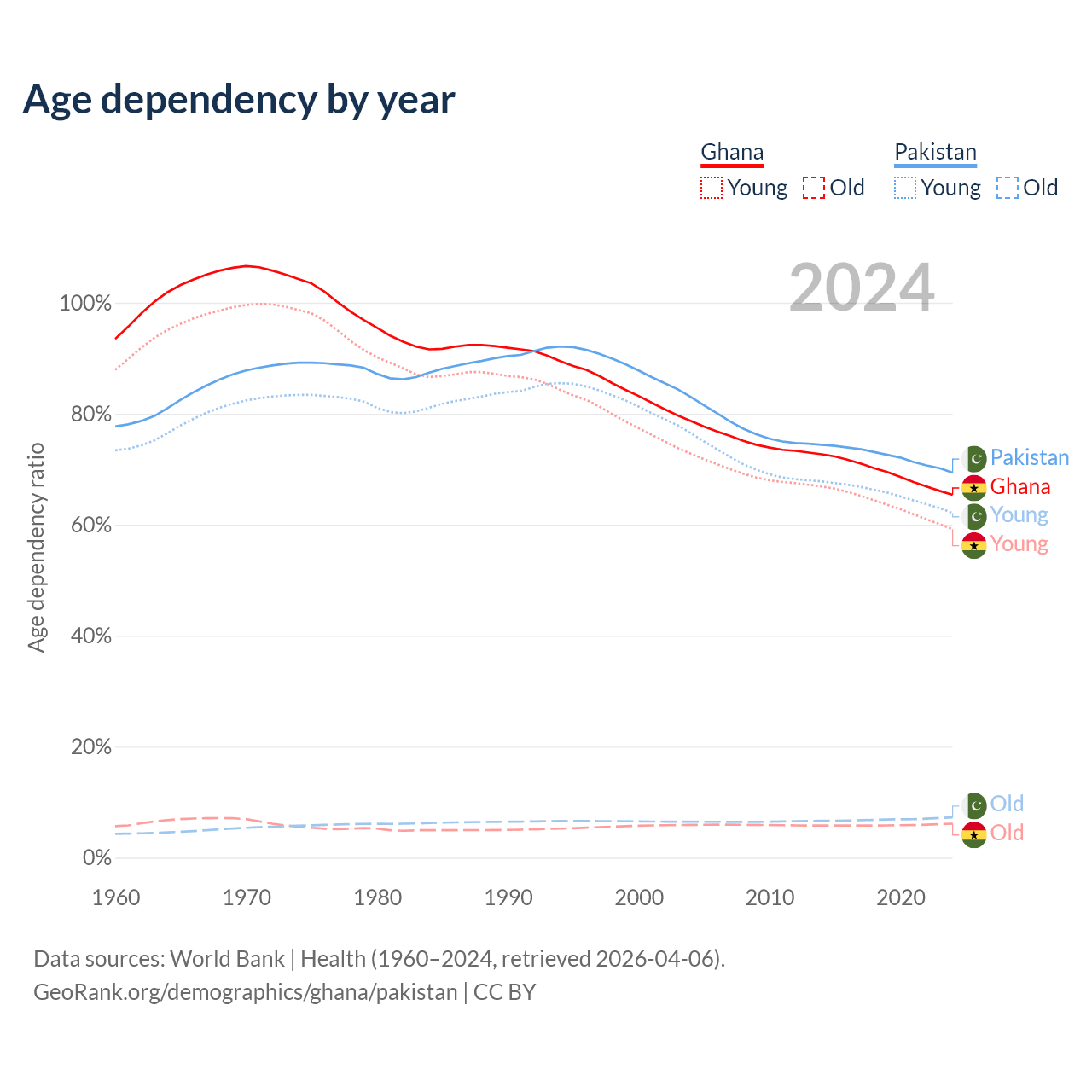 - The share of old-age demographic (65+) in Ghana is 3.71% vs 4.28% in Pakistan.