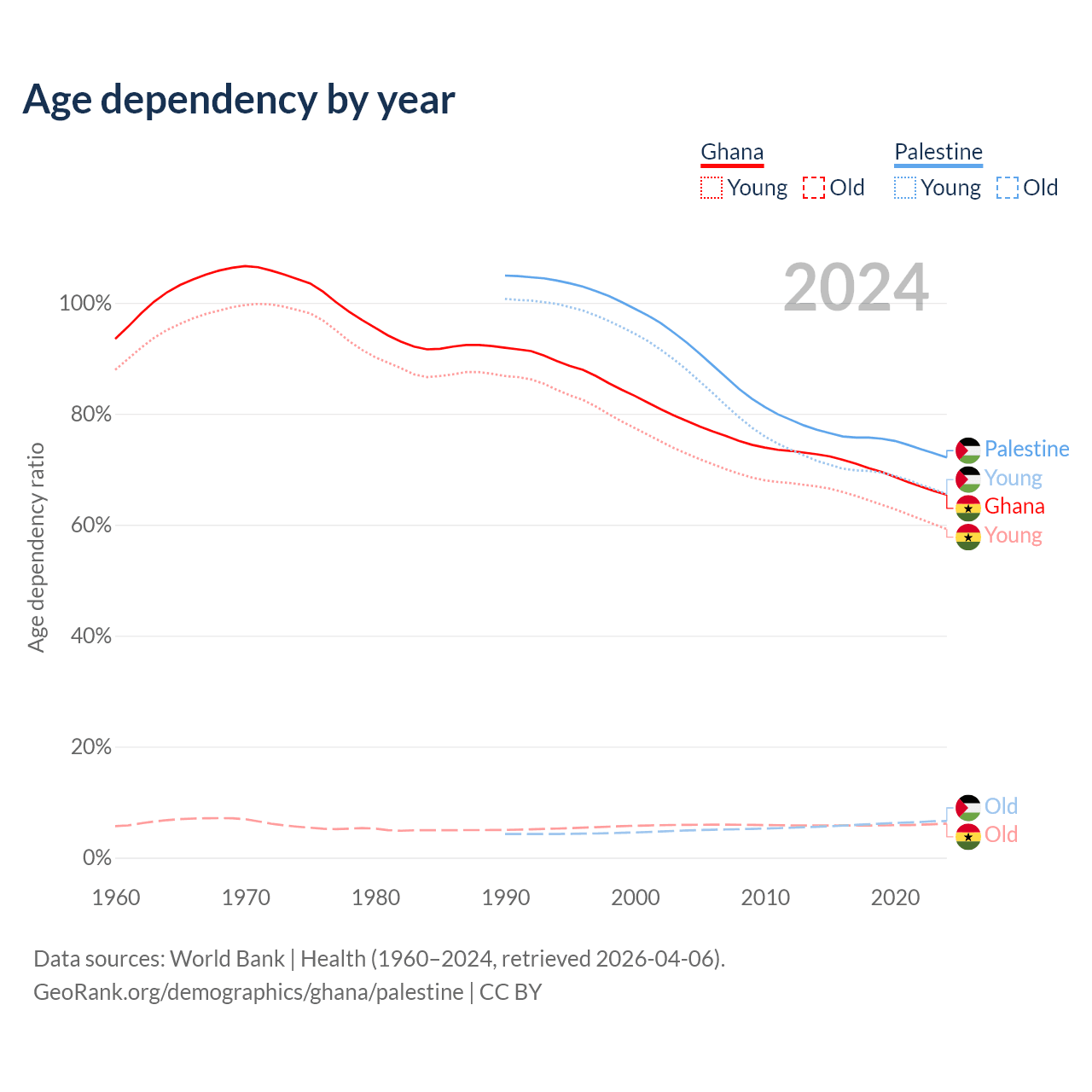 - Ghana is ranked 146/196 by median age (oldest to youngest) vs 157/196 for Palestine.