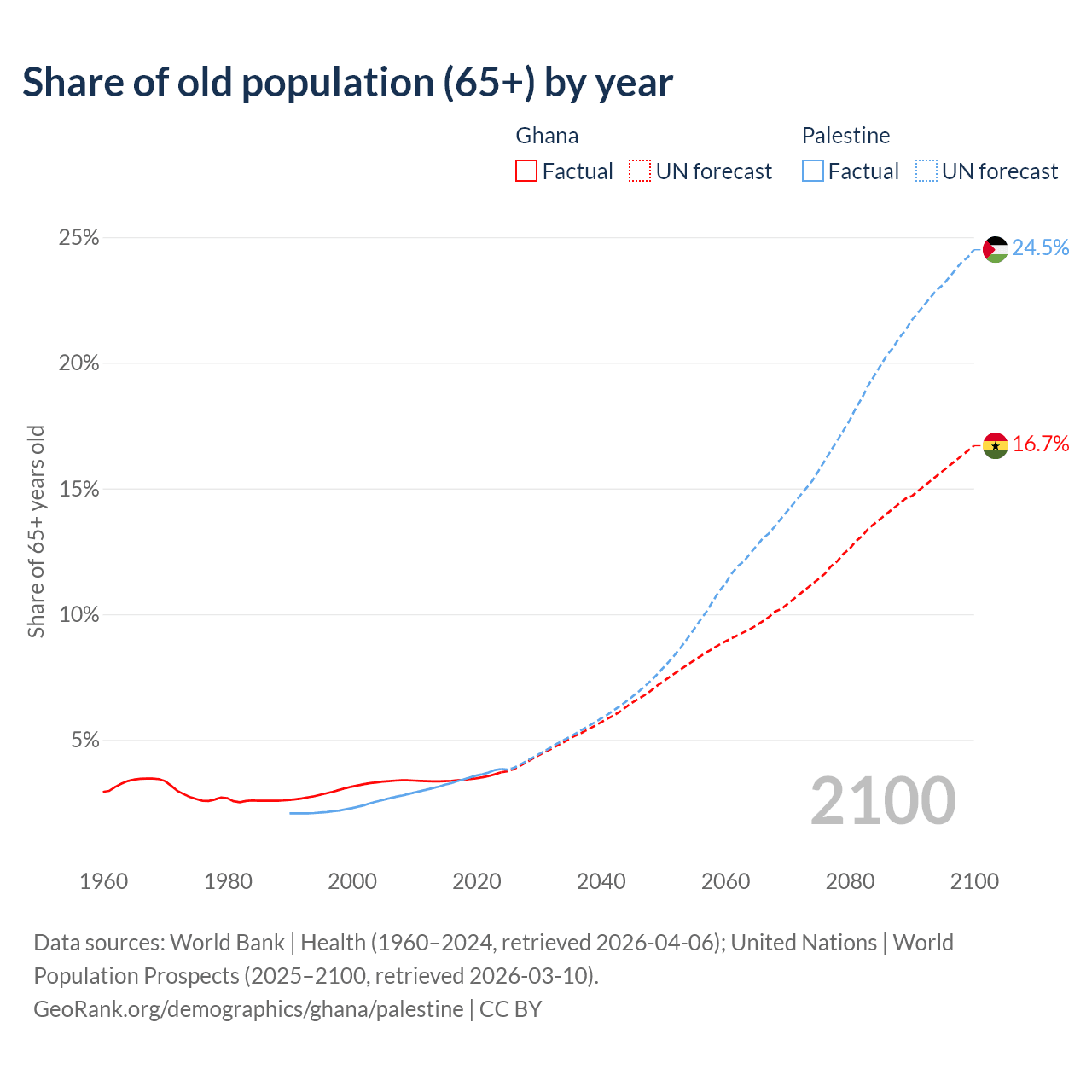 - The share of old-age demographic (65+) in Ghana is 3.71% vs 3.84% in Palestine.