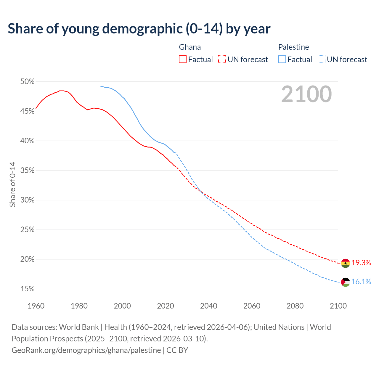 - The share of young demographic (0-15 years old) in Ghana is 35.8% vs 38% in Palestine.