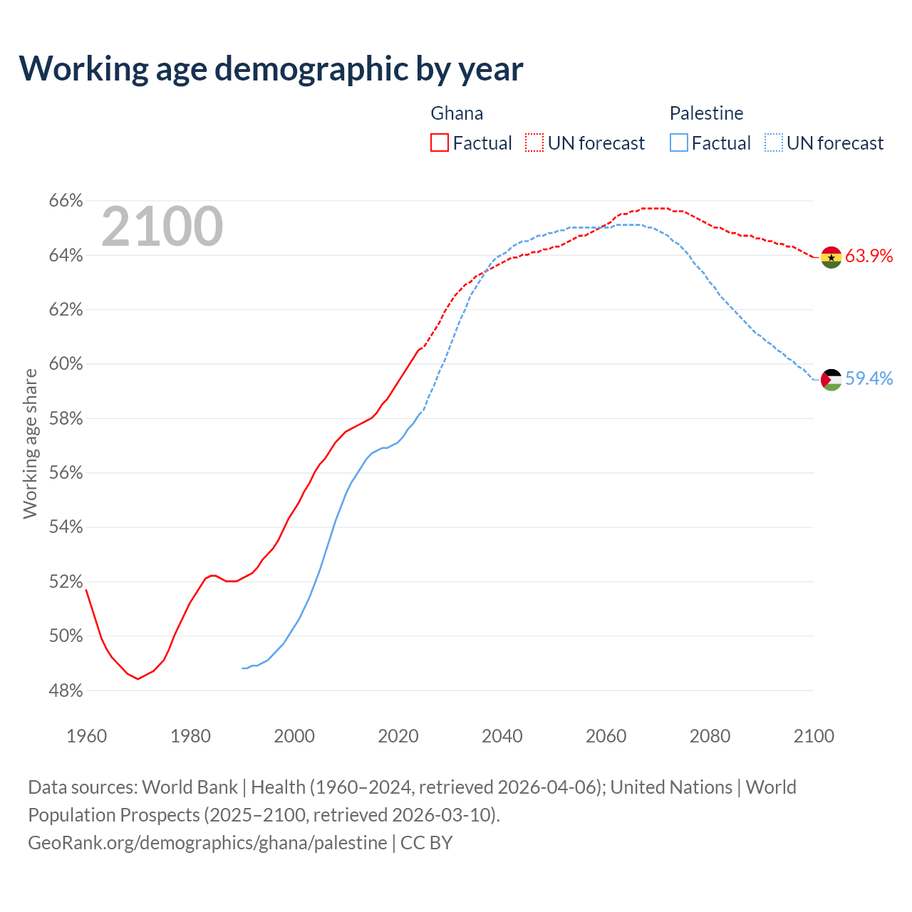 - Ghana has 21.7M working age adults (aged 15-64) vs 3.2M in Palestine.
