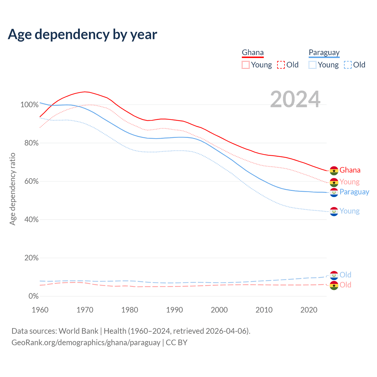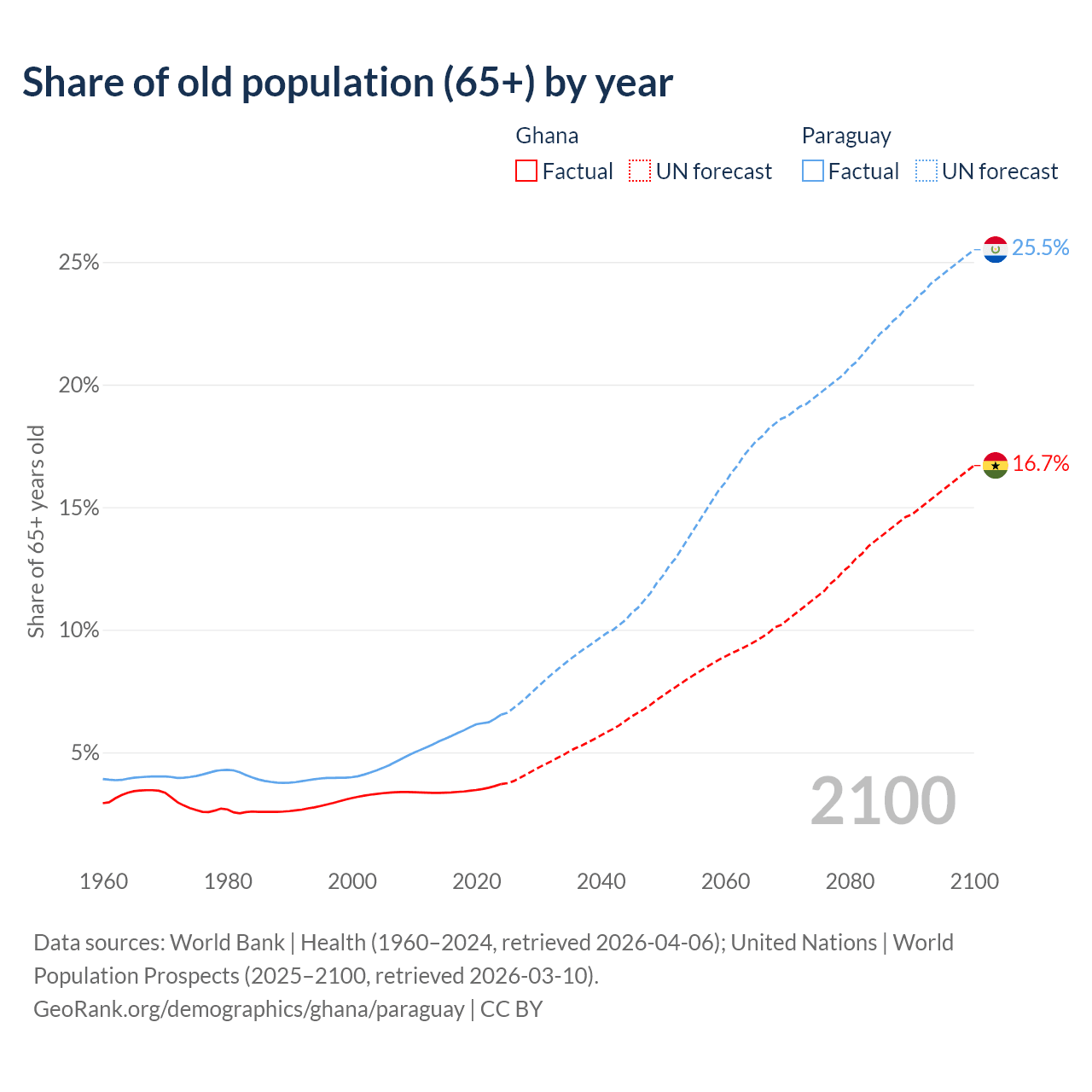 The share of older people aged 65 and over is 3.71% in Ghana and 6.54% in Paraguay. Life expectancy in Ghana compared to Paraguay .
