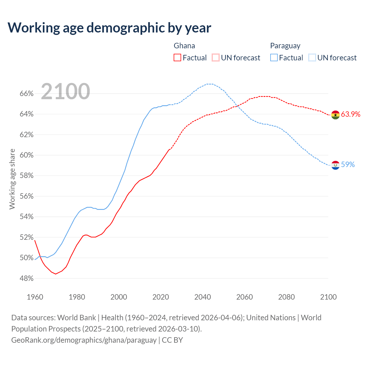 - Ghana has 21.7M working age adults (aged 15-64) vs 4.62M in Paraguay.