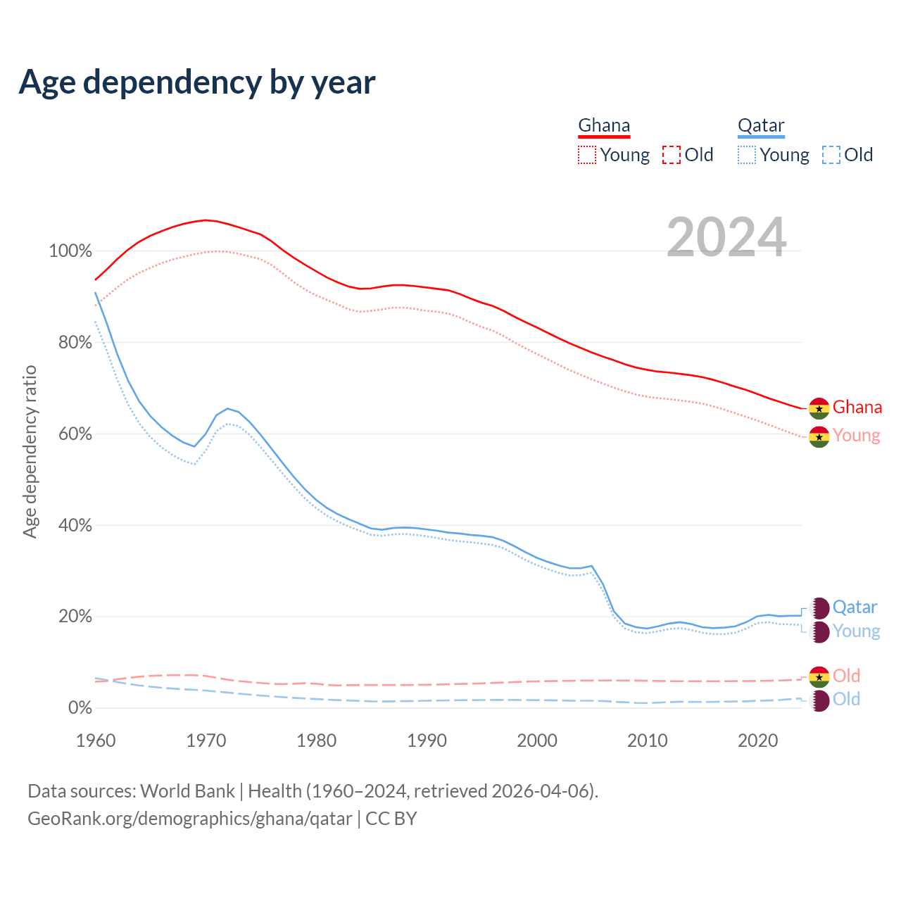 - Ghana is ranked 146/196 by median age (oldest to youngest) vs 78/196 for Qatar.