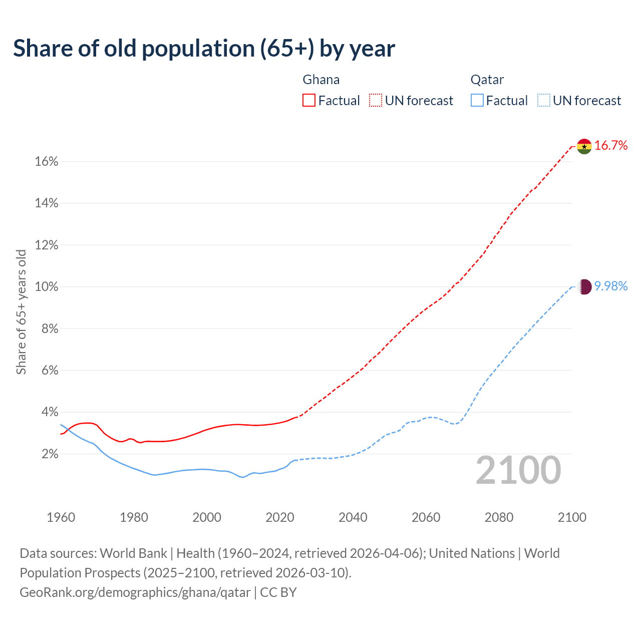 - The share of old-age demographic (65+) in Ghana is 3.71% vs 1.68% in Qatar.