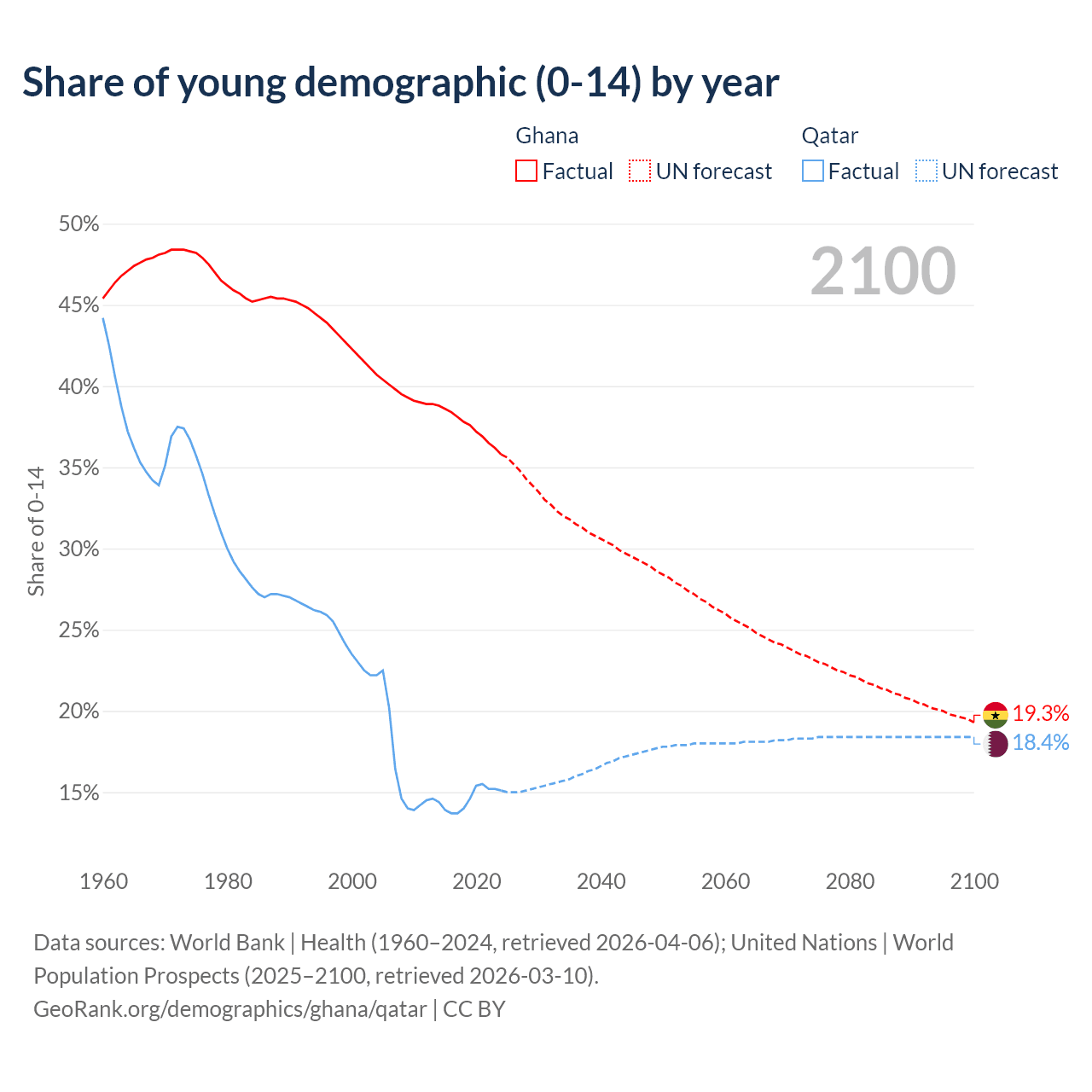 - The share of young demographic (0-15 years old) in Ghana is 35.8% vs 15.1% in Qatar.