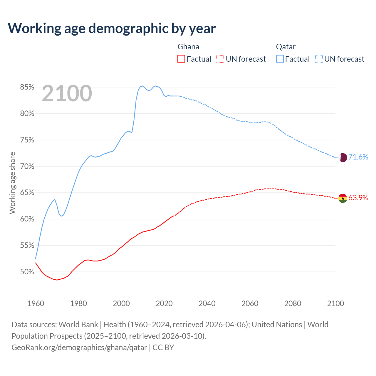 - Ghana has 21.7M working age adults (aged 15-64) vs 2.5M in Qatar.