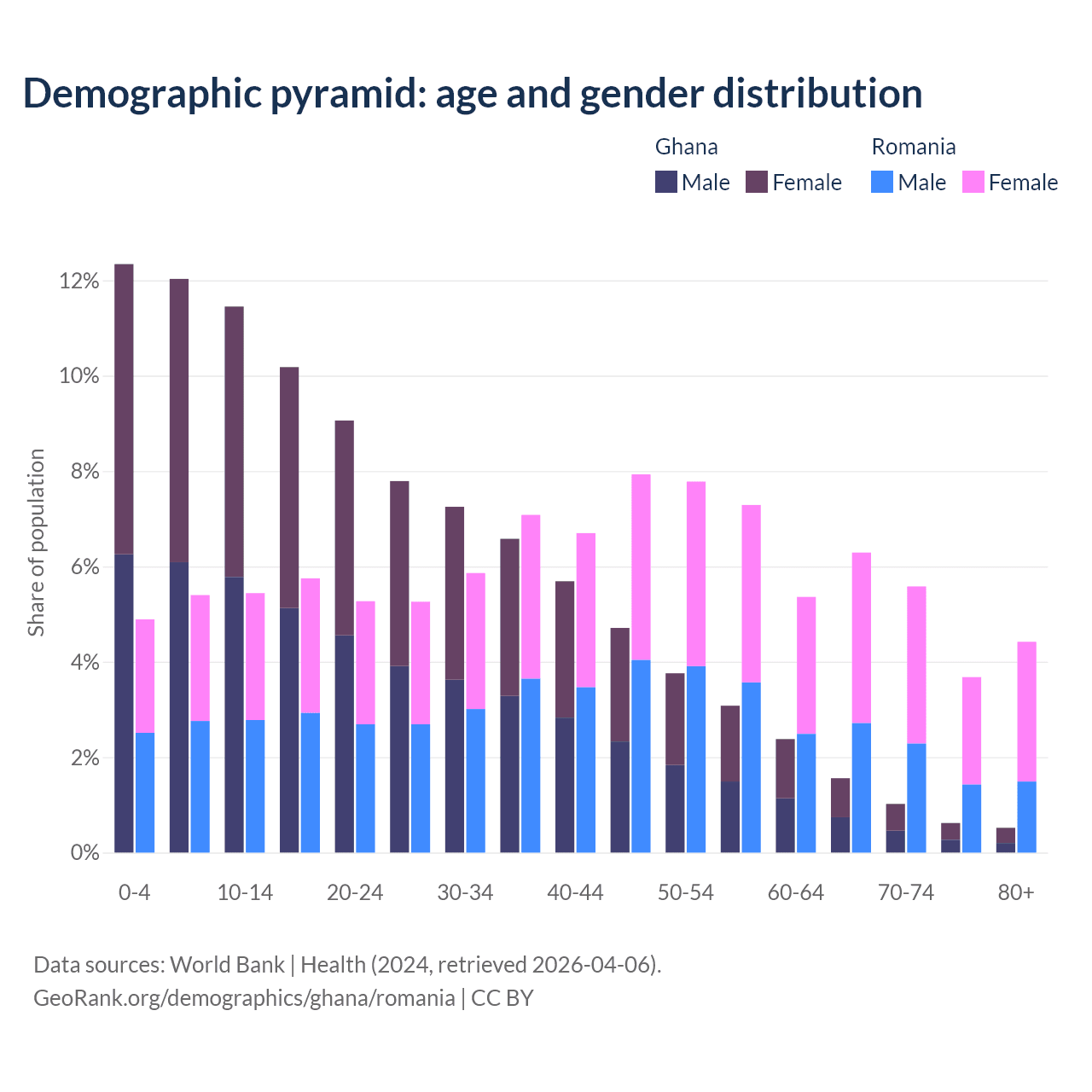 - Ghana is ranked 146/196 by median age (oldest to youngest) vs 23/196 for Romania.